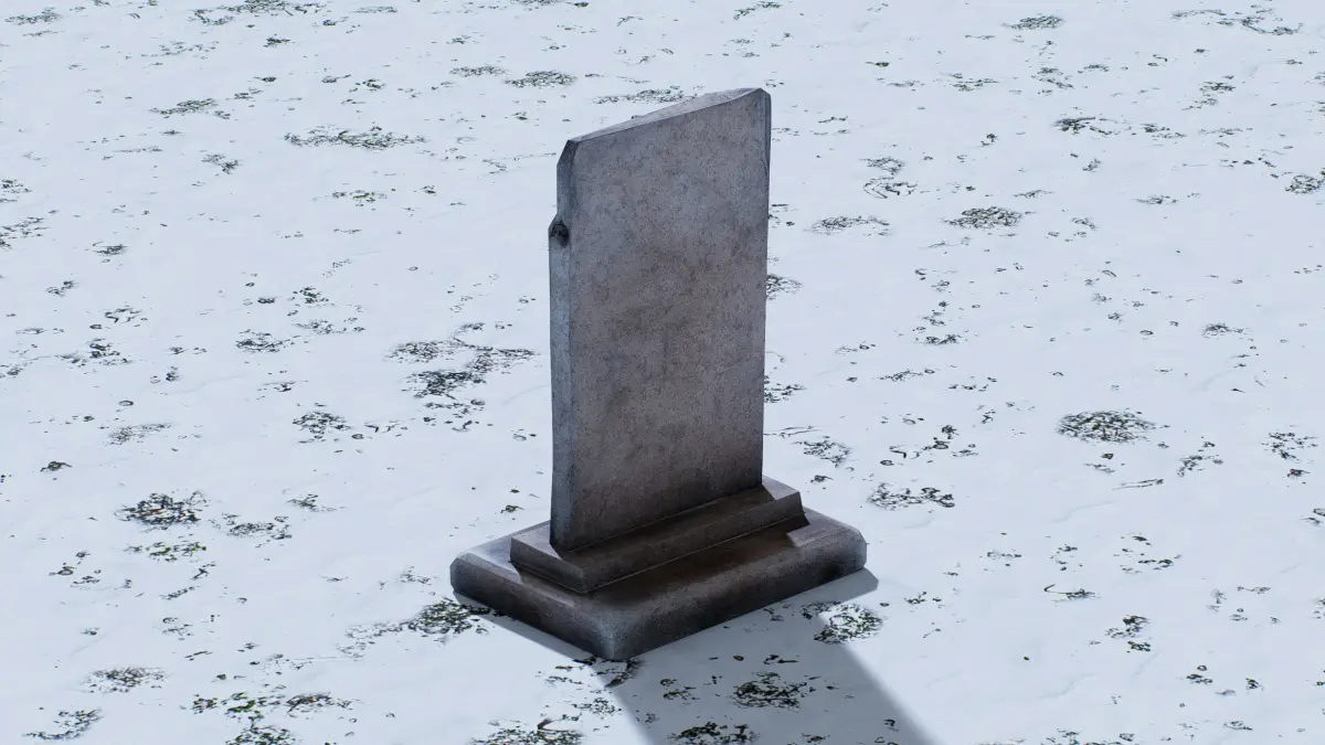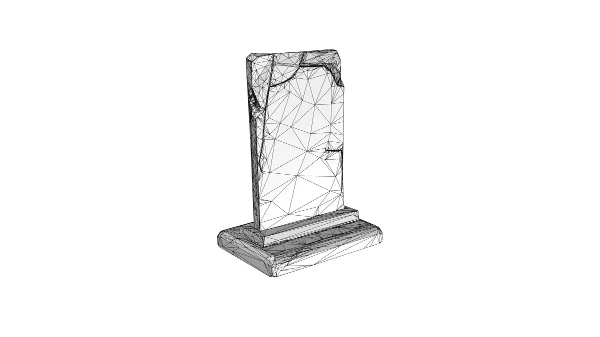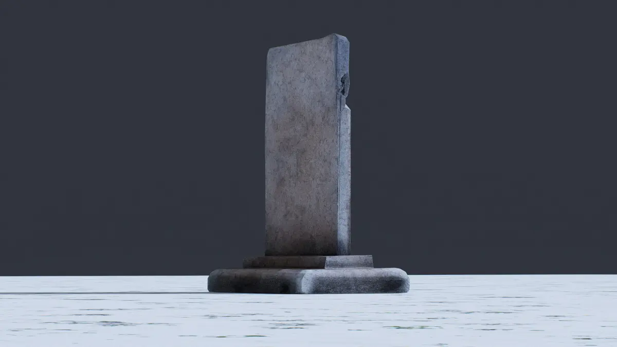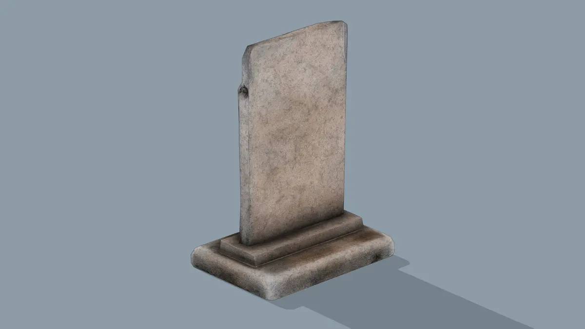 This 3D low-poly model depicts a weathered, wordless gravestone with a minimalist yet haunting design. The structure features a tall, rectangular stone slab with visible cracks and a worn texture, mounted on a simple base. Its aged appearance, accentuated by subtle shadows, evokes a sense of history and mystery, making it perfect for use in historical simulations, eerie game environments, or artistic renderings of forgotten cemeteries.