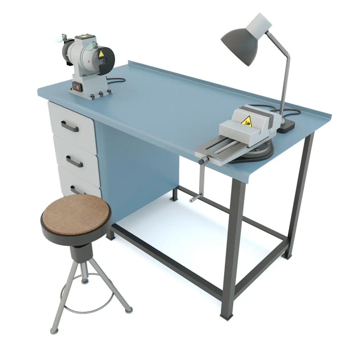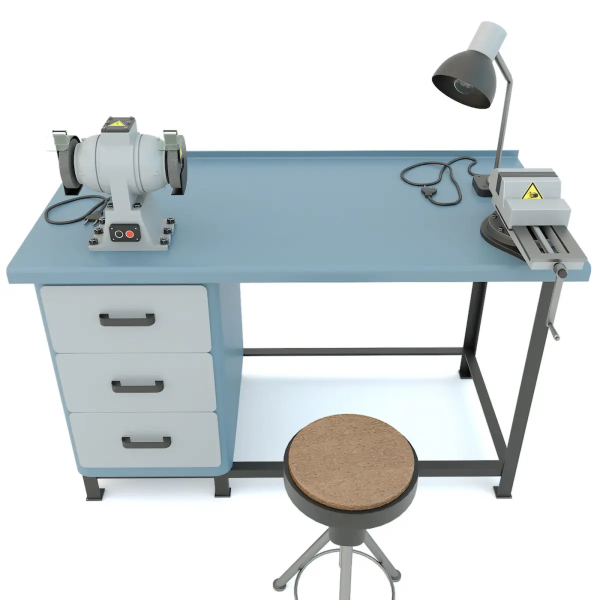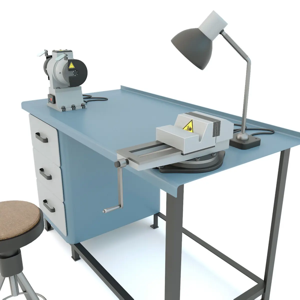 3d Model: Another successfully implemented project created in our studio is a workbench with filling tools for a garage, but the model is also perfectly suitable for the industrial direction, for example, for implementation in a particular type of production. In fact, the 3d model presented to your attention is a collection that contains five items at once. This is a workbench, an industrial chair and a lamp located on the workbench, a table sander or emery, a large production vise. Thus, the presented collection of models can be successfully used for a wide variety of projects that require the highest quality, as well as realistic visualization. We also draw your attention to the fact that absolutely all models in the collection have a high degree of elaboration during modeling, as well as the elaboration of even the smallest elements. The models have an industrial color and some textures that give the appearance more realistic, which in general, in our opinion, is a natural factor.