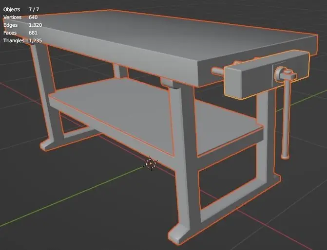 Workbench, carpentry table low-poly 3D objectVertices-640Faces-681Modeling in BlenderTextures:AO,BaseColor,Metallic,NormalDirectX,NormalOpenGL,Roughnessresolution 1K,2K,4KBaking and texturing- Substance Painter,PBR Metallic-Roughness