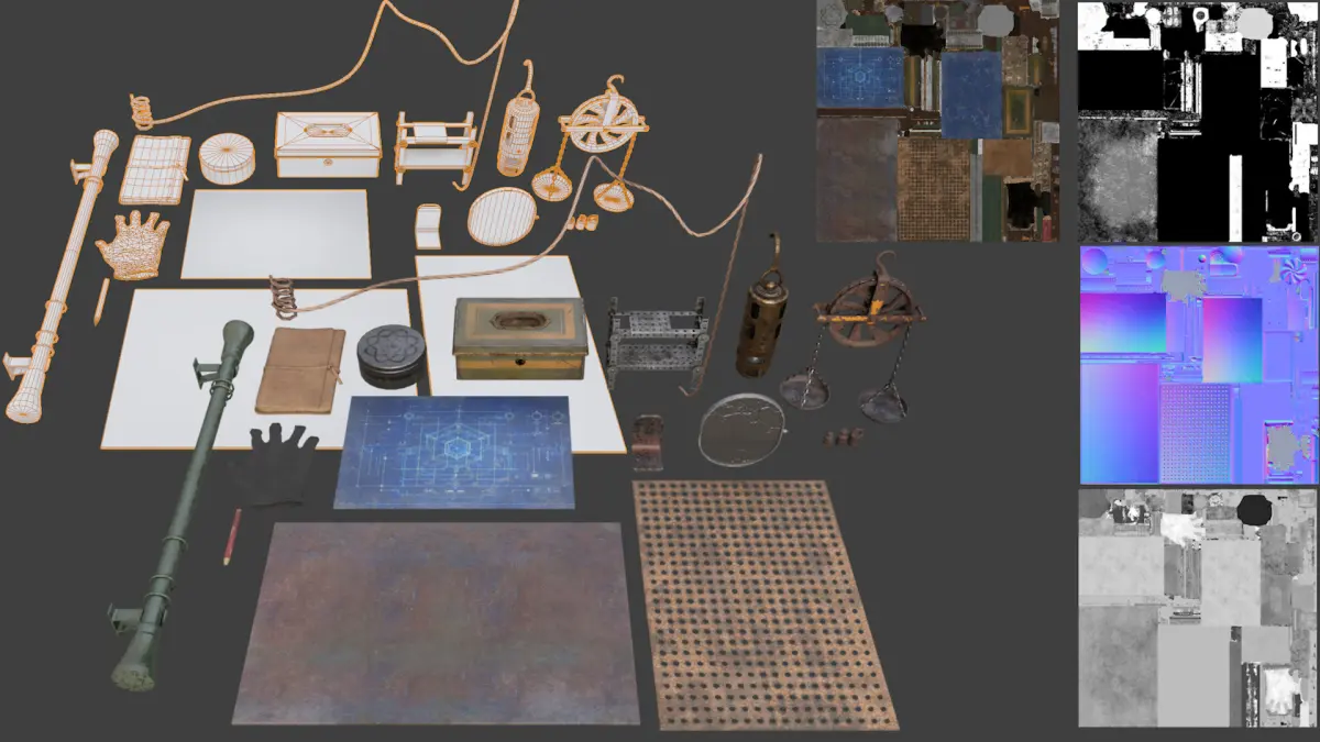 The asset pack consists of 55 models with a total polygon count of 62k. When assembled, the polygon count is 100k.A separate texture set is used for the wood material (for the entire table), another one for all the decorations, as well as for the tools.The resolution of all textures is 2k.