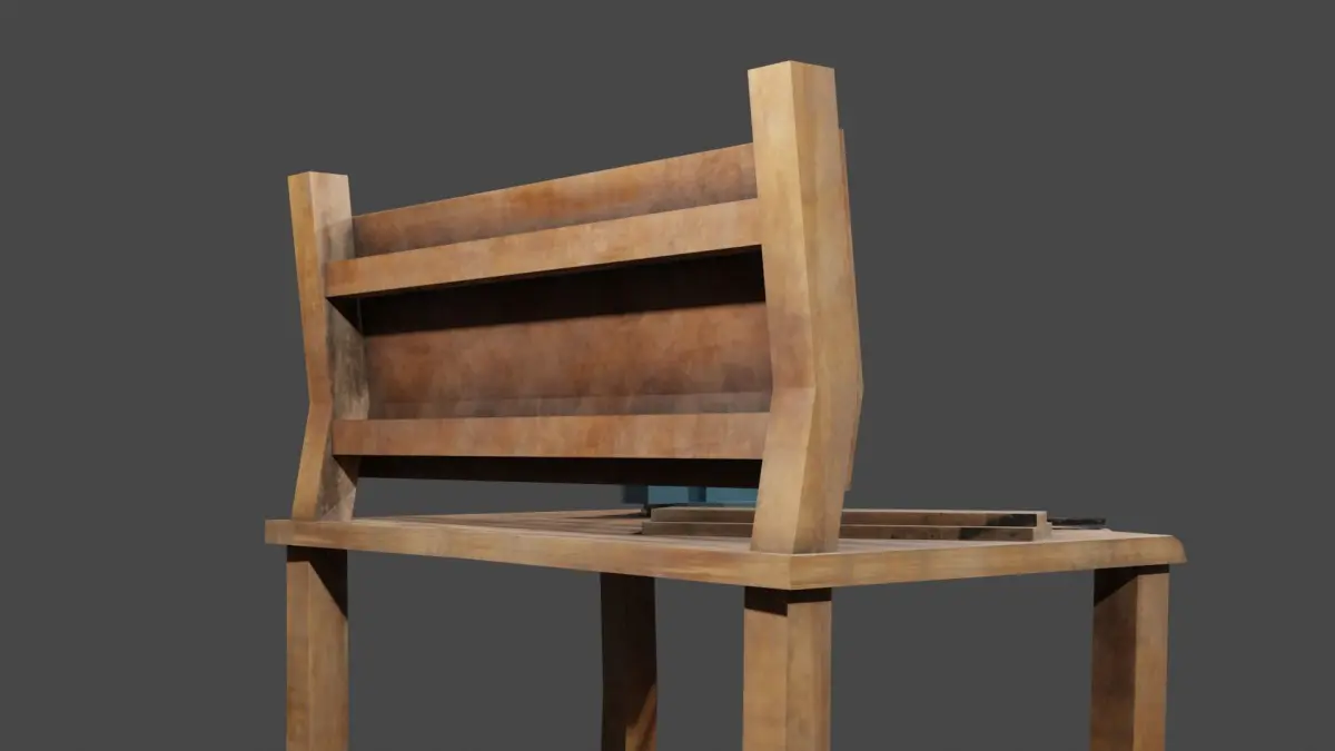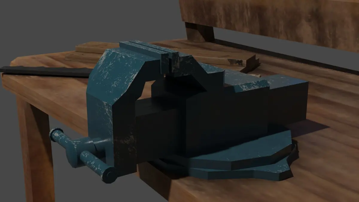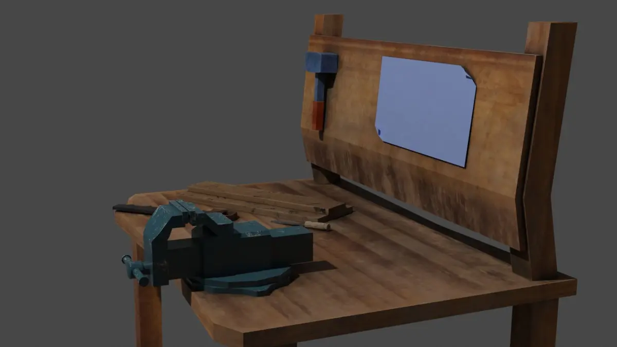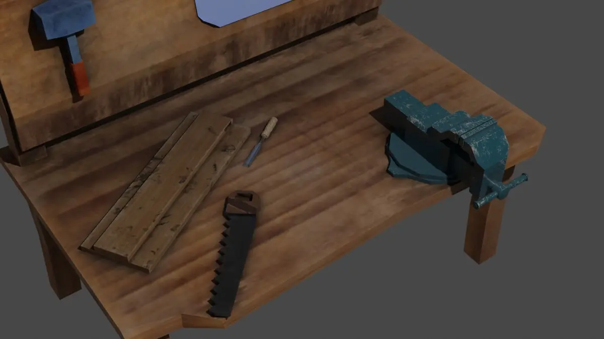 low poly workbench, for survival games. Wooden table, boards, vise, chisel, hammer and blueprint.