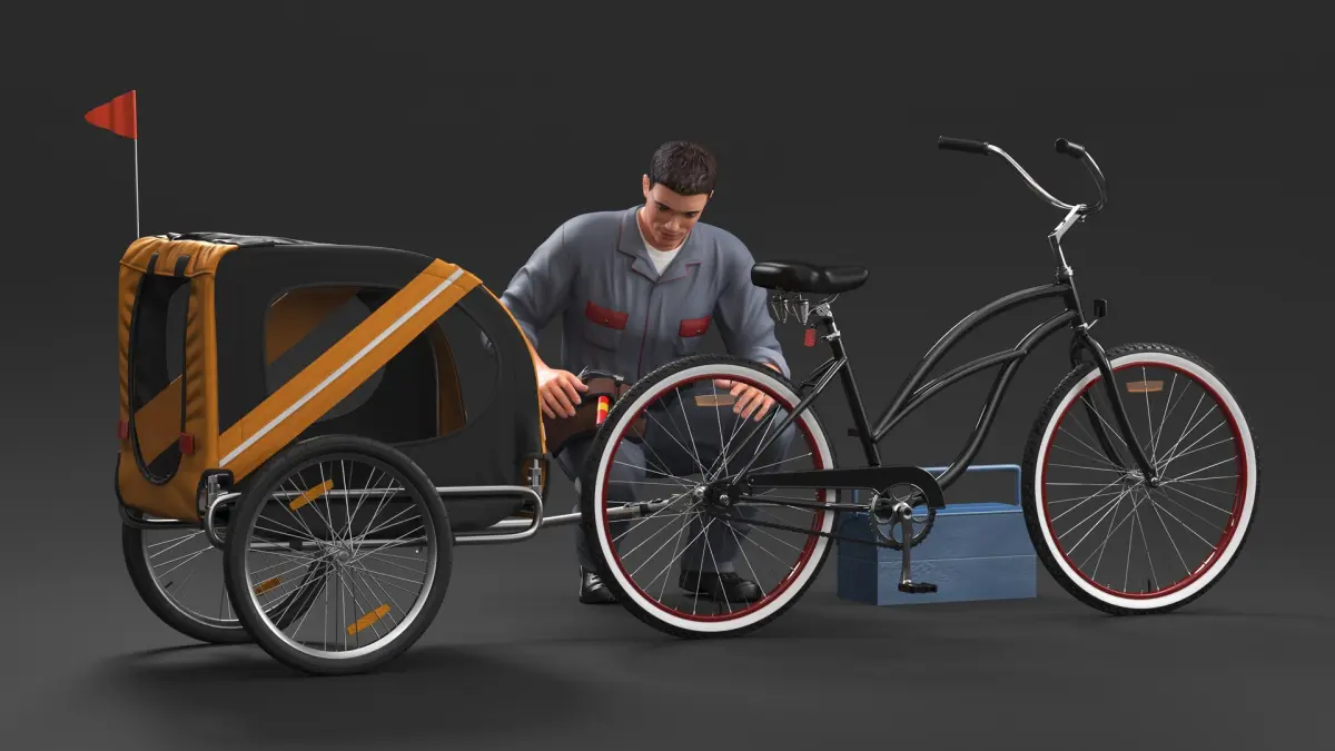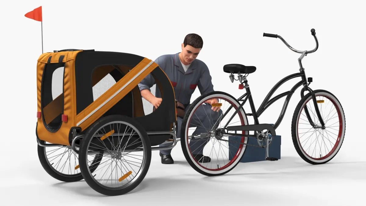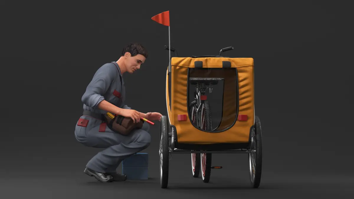 Worker Attaches Pet Trailer to Bicycle is a three-dimensional model of male character (young man) who hitch the pet bike trailer (wheeled animal cabin or cart that designed to be towed by a cycle or bike).