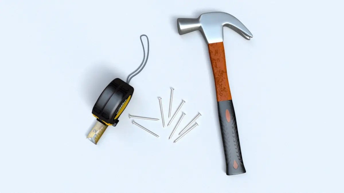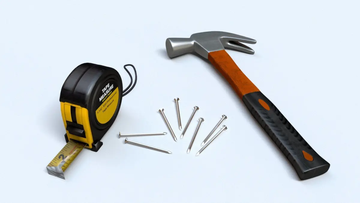 Low Poly, render ready Worker tool set - Hammer, Nails, Tape measure