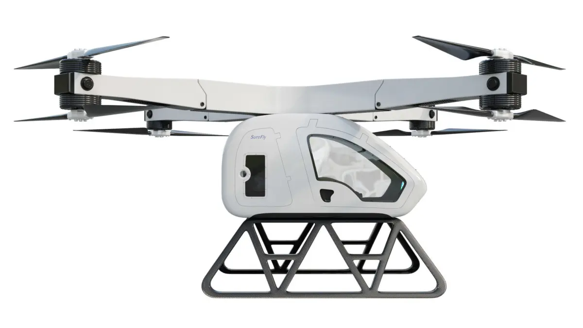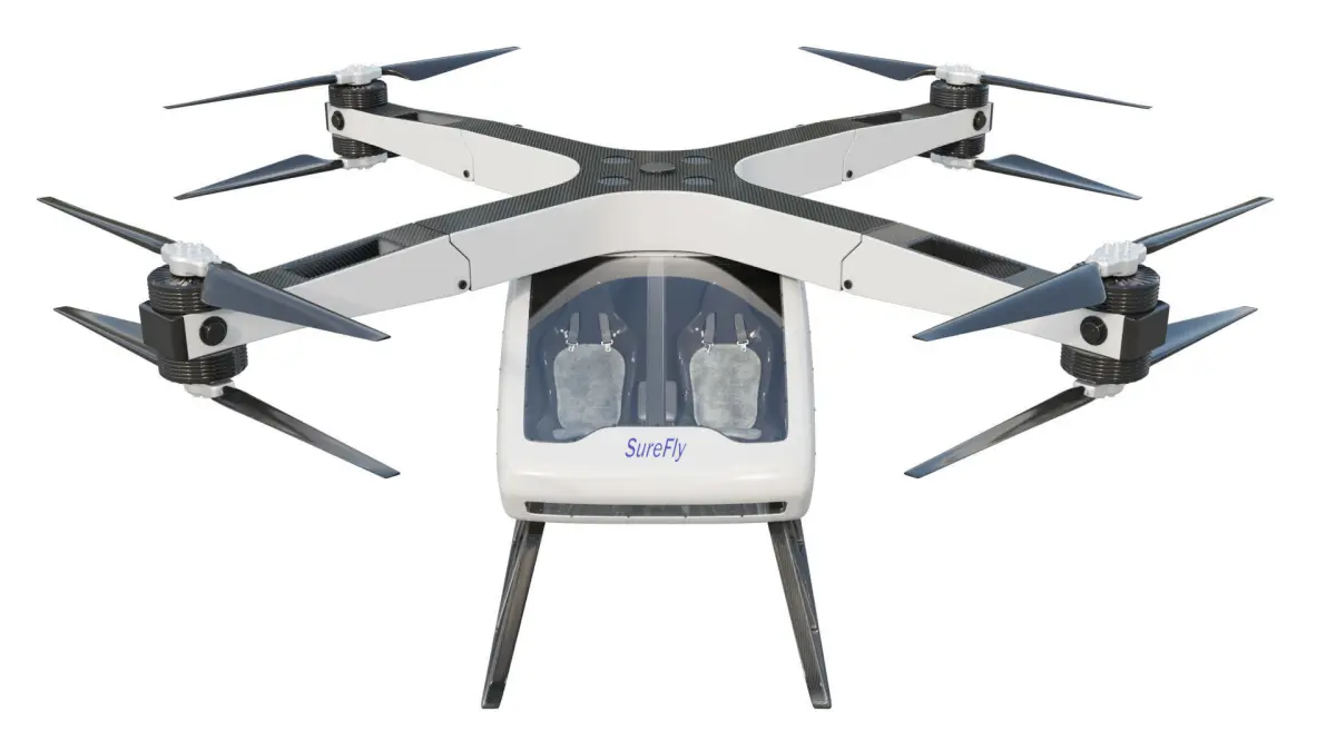 The 1,100 kg Workhorse Surefly uses an electric quadcopter layout with two contra-rotating propellers on each corner and a range-extending petrol engine, giving it a range of 70 miles and a top speed of 70 mph. The gas engine can then be fueled quickly with petroleum for immediate onward flight.The Surefly thus could easily become a two-seat sportscar of the skies with a very affordable price tag.