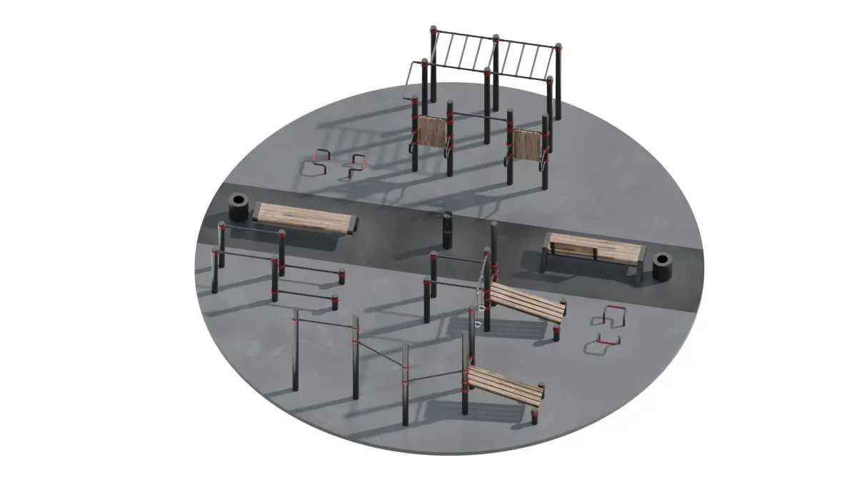 Workout Space workout area, with horizontal bars, bars, press equipment, benches and a drinking fountain, diameter 10m