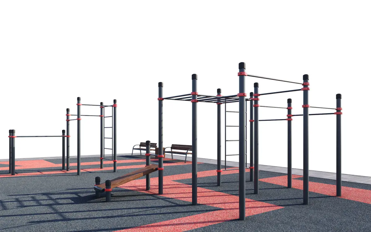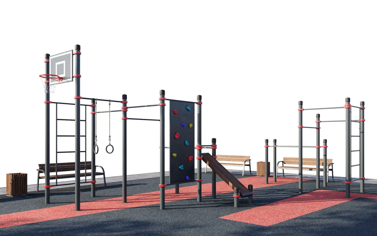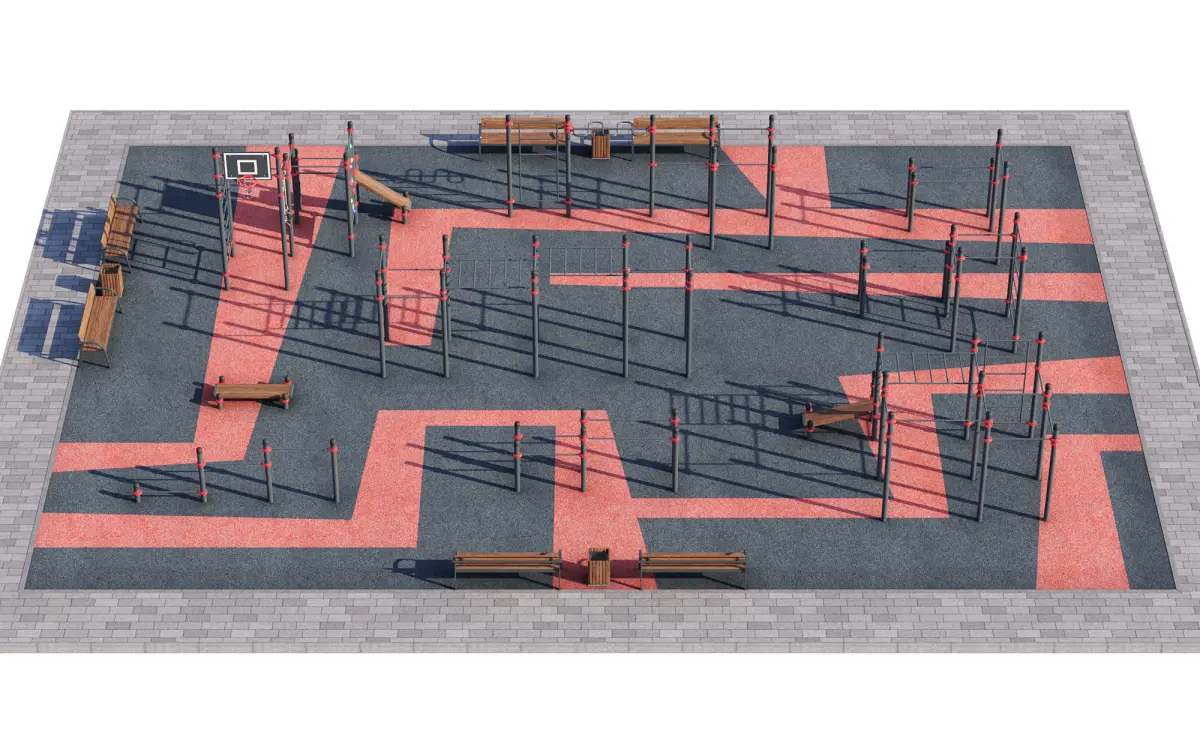 Sports training ground with horizontal bars on a surface made of pressed rubber crumb.Can be used as a children's sports playground in the yard or park.Perfect for filling the exterior and will fit well into the modern urban environment. The colors of the equipment are easily edited.The site has horizontal bars of various heights, a complex with a basketball hoop and a climbing wall, a bench for abdominal training, parallel bars, etc.The size of the site in the plan: 25 x 19 meters, but there is the possibility of editing and rearranging the equipment to suit any size and parameters.Sports equipment from Kenguru PRO:Triple cascade of horizontal bars Andeg K-001/ST, classic two-level monkey bars Dikson (Aikhal) K-006/ST, serpentine monkey bars and wall bars Kovdor K-004/ST, parallel bars and horizontal bars Tiksi K-005/ST, double parallel bars Kromy K-009/ST, bench Atka K-015/ST, complex with inclined bench Kanak K-030/ST, complex with basketball backboard and rings Resolute K-050/ST, parallel bars with horizontal bar Tumat K-052/STBench: KSIL - Garden and park sofa - 002205Urn: KSIL - Wooden urn with reinforced concrete base - 001311