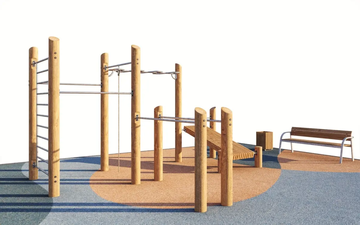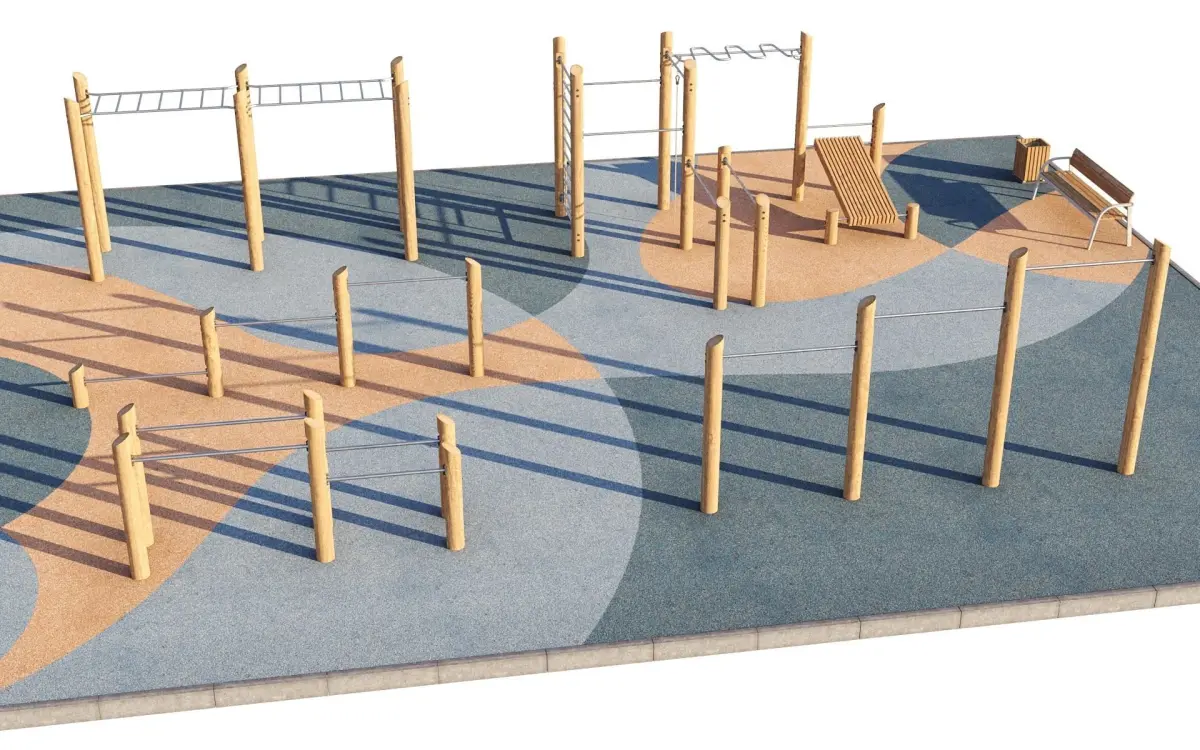 Eco-style sports training ground with horizontal bars on the surface of compressed rubber crumb.On the site there are horizontal bars of various heights, a complex with a bench for training the press, bars, etc.Can be used as a childrens playground in the yard or park.Site size: 18 x 13 meters, but it is possible to edit and rearrange the equipment to fit any size and parameters.Perfect for filling the exterior and will fit well into the modern urban environment.