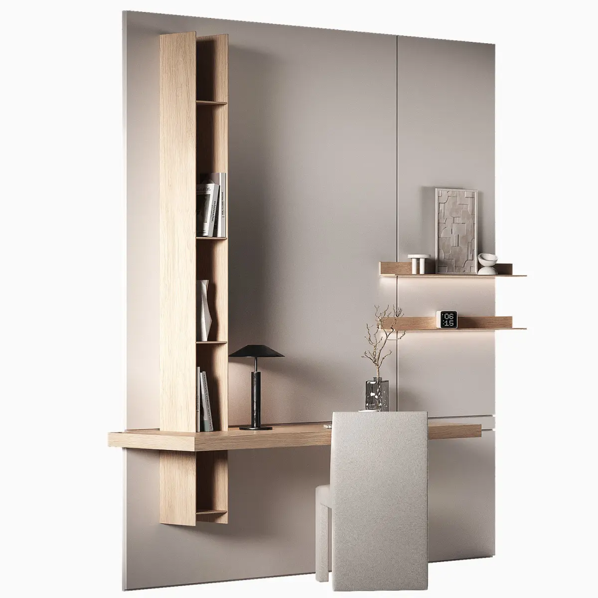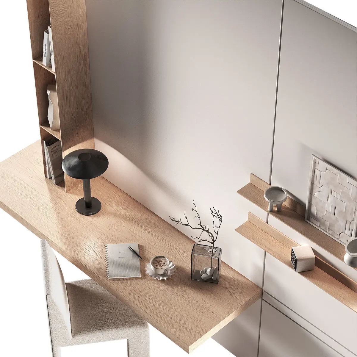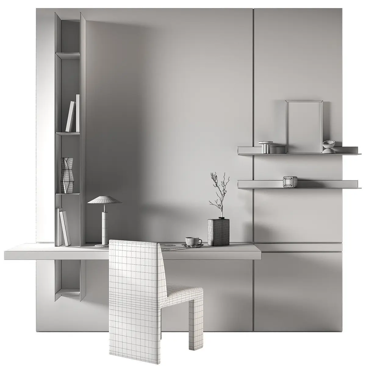 The 3D model contains a workplace made of minimalist furniture.The set includes: a hanging desk top, shelving, a chair, a table lamp, a notebook, a sketchbook, a pen, a cup of coffee, books, a clock, vases, a decorative relief panel, branches of dried flowers in a glass vase.