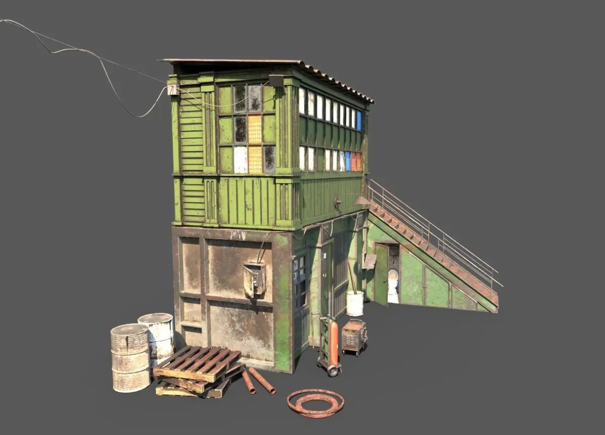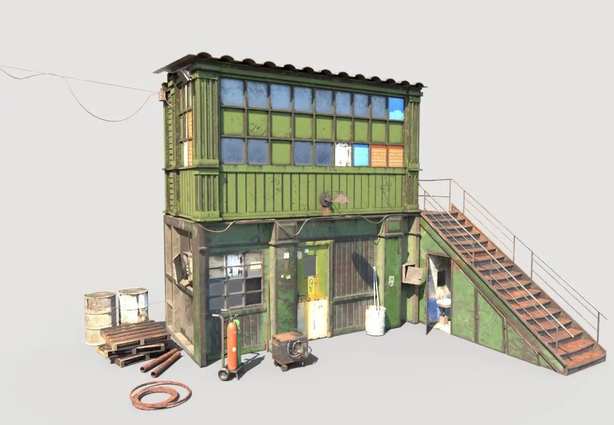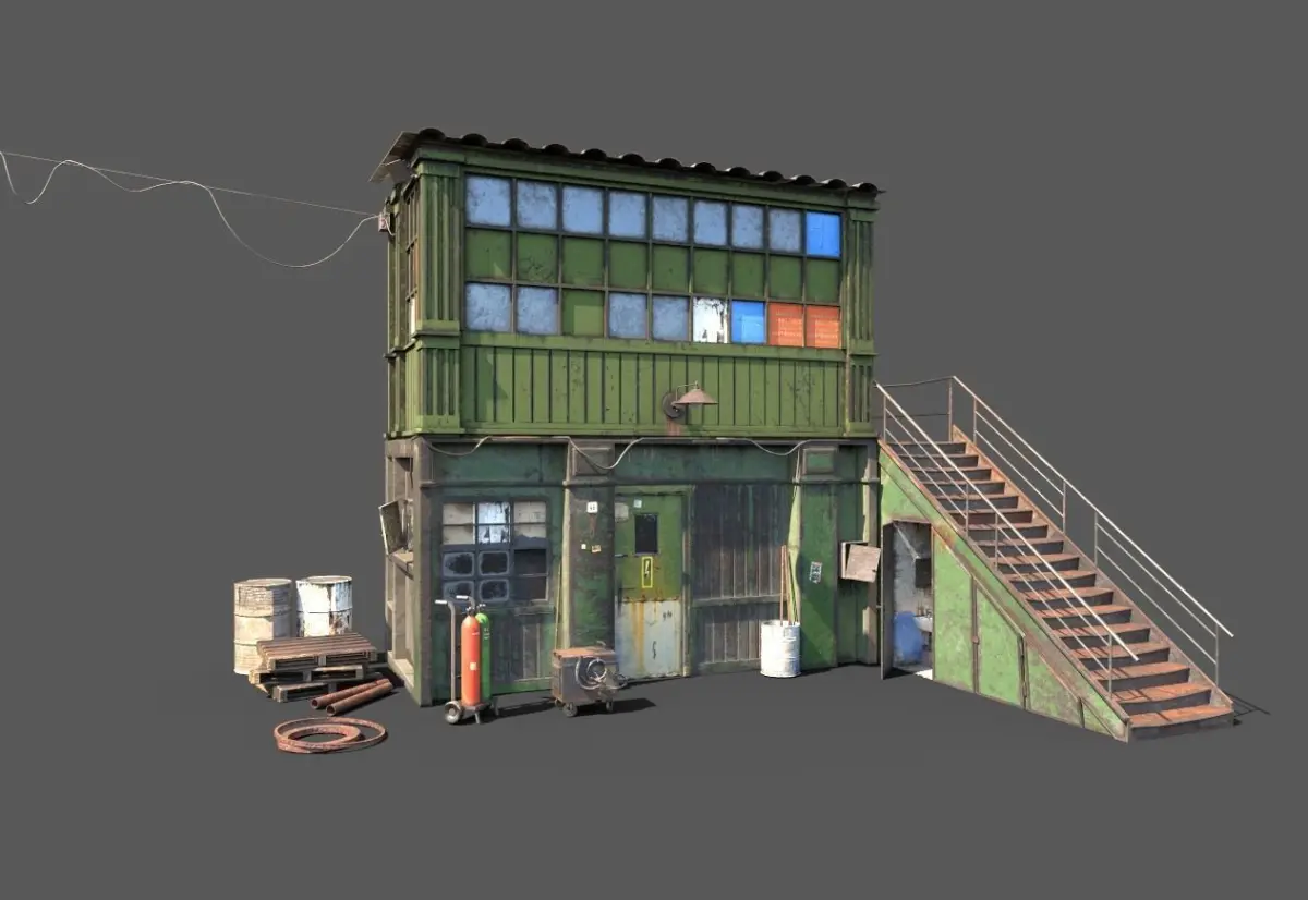 Model of work shop with office. The whole scene is one mesh. Model is very realistic.It has 6 PBR material.Maps are diffuse-specular-glossiness-height and normal. Model's textures has two sizes; 4096x4096-2048x2048. All maps are PNG formats and unwrapped, non-overlapping.