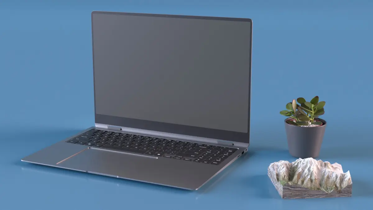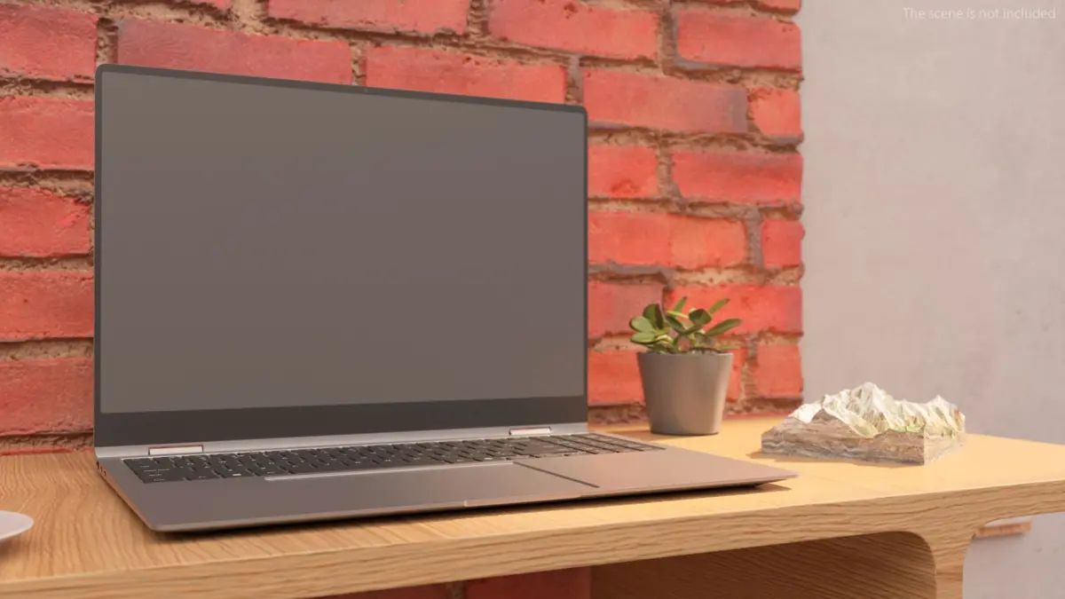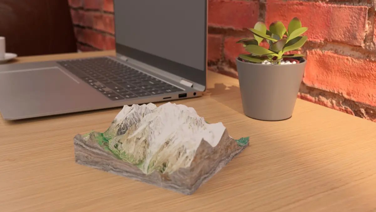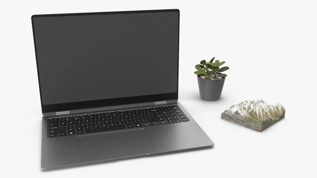 This model includes a sleek laptop placed on a minimalistic desk, complemented by an indoor plant and a mountain sculpture. The setup is designed with clean lines and neutral tones, ideal for creating a professional yet inviting workspace aesthetic. The attention to detail in the laptop and decor items makes it perfect for showcasing realistic and visually appealing environments.