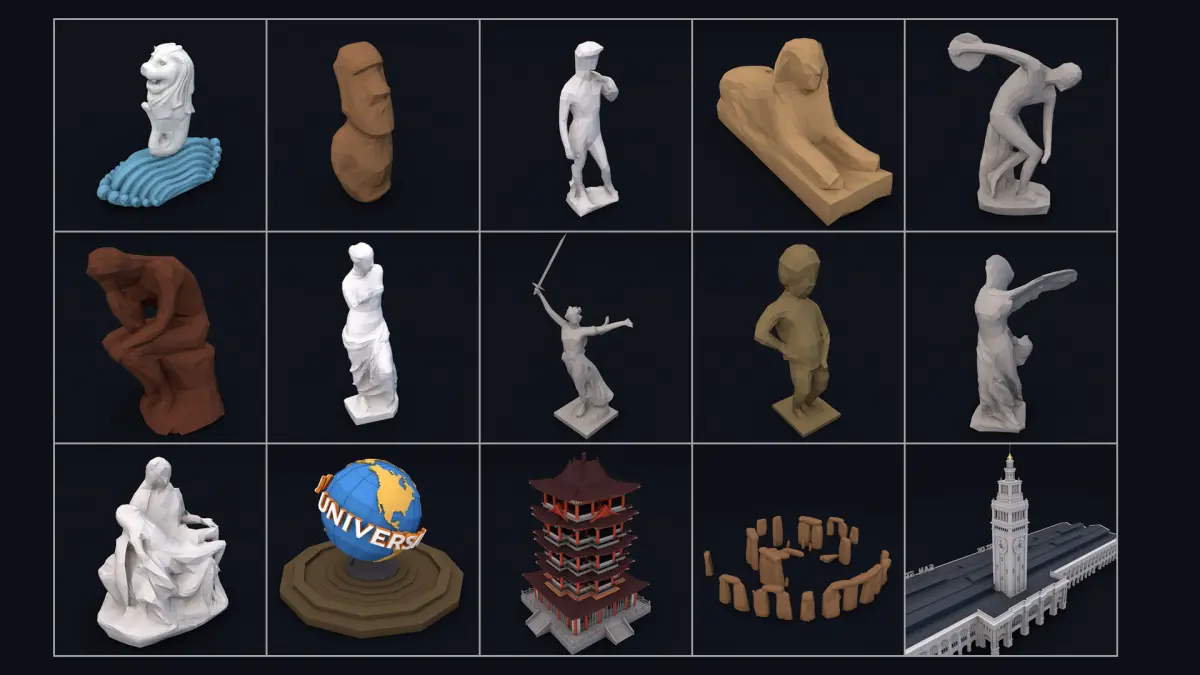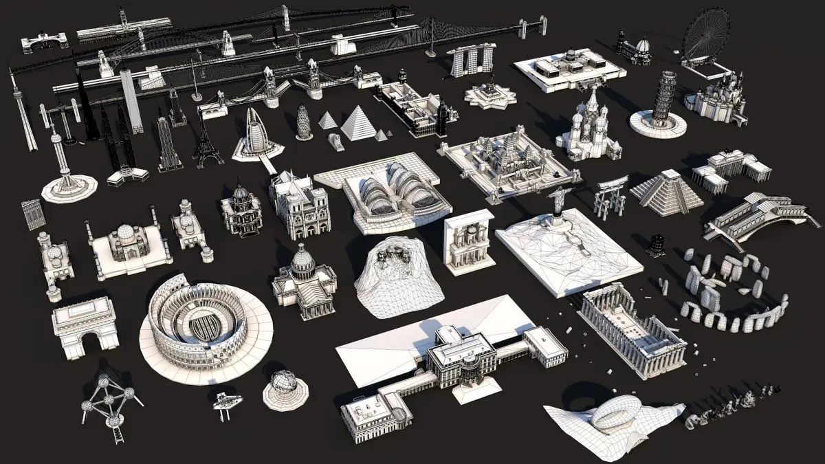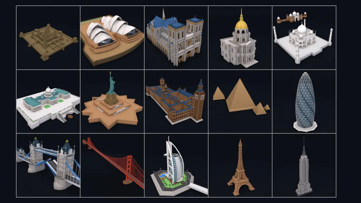 Items (x65):Merlin Statue, Moai, David, The Great Sphinx, The Discus Thrower, The Thinker, Venus Di Milo, Motherland Calls, Manneken Pis, Nike Of Samothrace, Pieta, Universal Studio Globe, Chinese Pagoda, Stonehenge, Parthenon Greece, The White House, Florence Cathedral, Brandenburg Gate, Chichen Itza Pyramid, Japanese Tori, Christ Redeemer Statue, Petra Jordania, Mount Rushmoor, Pantheon, Colosseum, Arc of Triomphe, Disney Castle, Pisa Tower, St. Basil's Cathedral, Angkor Wat, Sydney Opera House, Notre Dame De Paris, Dome Des Invalides, Taj Mahal, United States Capitol Hill, Statue of Liberty, Big Ben Parliament, London Eye, Pyramids of Giza, The Gherkin Tower, London Tower Bridge, Golden Gate Bridge, Burj Al Arab Building, Eiffel Tower, Empire State Building, Petronas Twin Towers, Shanghai Oriental Pearl Tower, Las Vegas Sign, Atomium, One World Trade Center, Burj Khalifa Dubai Tower, Chrysler Skyscraper, Flatiron, Brooklyn Bridge, Manhattan Bridge, Marina Bay Sands Singapore, Ferry Building, Denver City Hall, Milad Tower, CN tower, Rialto Bridge, Sydney Harbour Bridge, George Washington Bridge, Museum of the Future Dubai