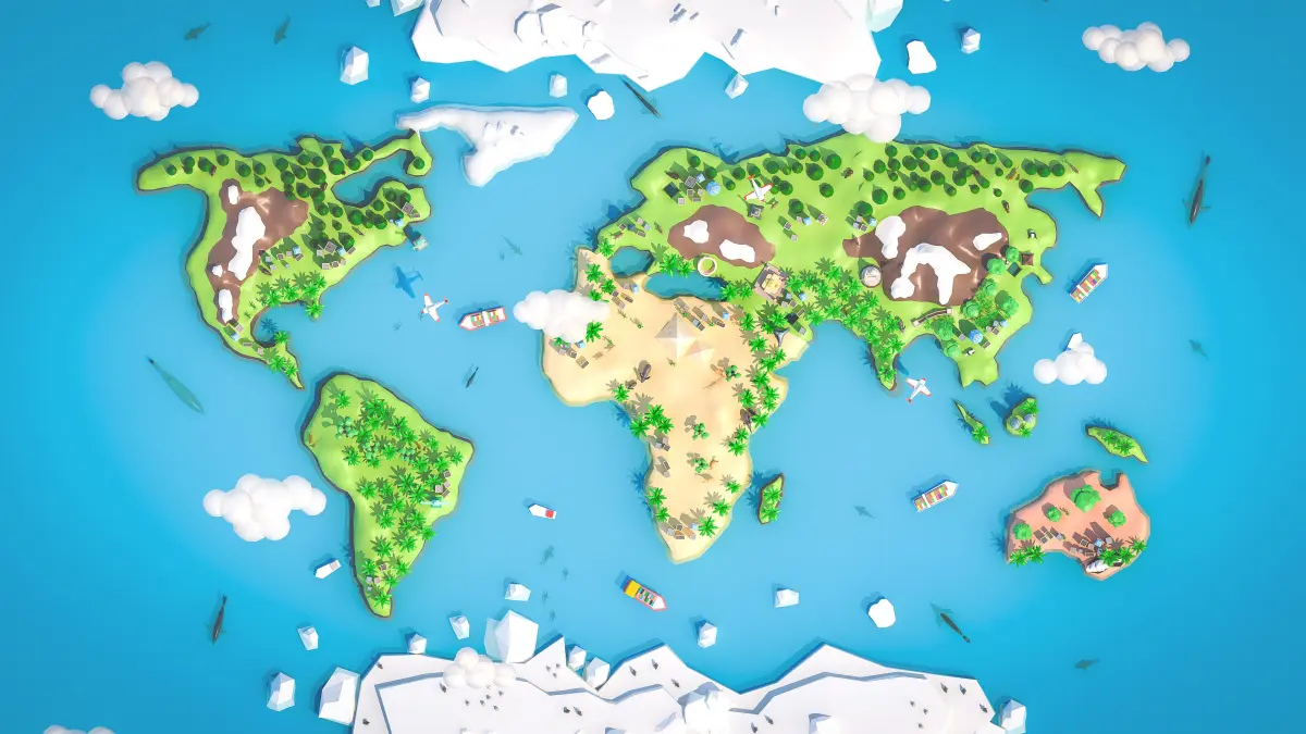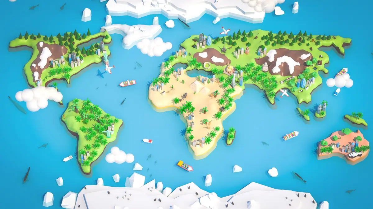 World Map is a package of low-polygon 3D models optimized for game engines, consisting of 95 assets such as landscape, buildings, transport, animals, props.