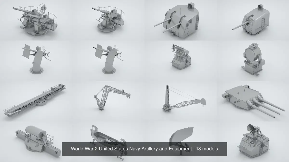 These collection includes most of the artillery, naval guns, anti-air guns and equipment (Control Systems, Radar, Lifeboats, Cranes, Catapults etc.) United States Navy used on their warships