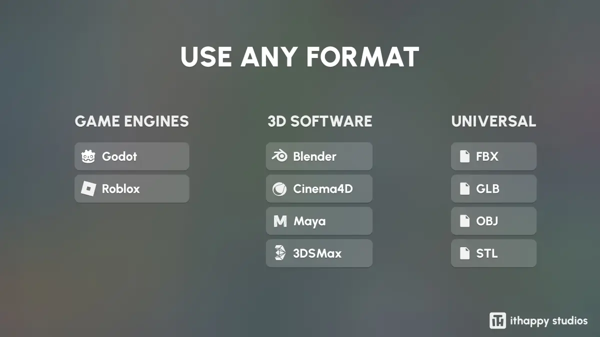 FILESYou’ll be able to download formats such as Unity Package, UE, Blender, C4D, Maya, 3DSMax, FBX, OBJ, GLTF, and STL.