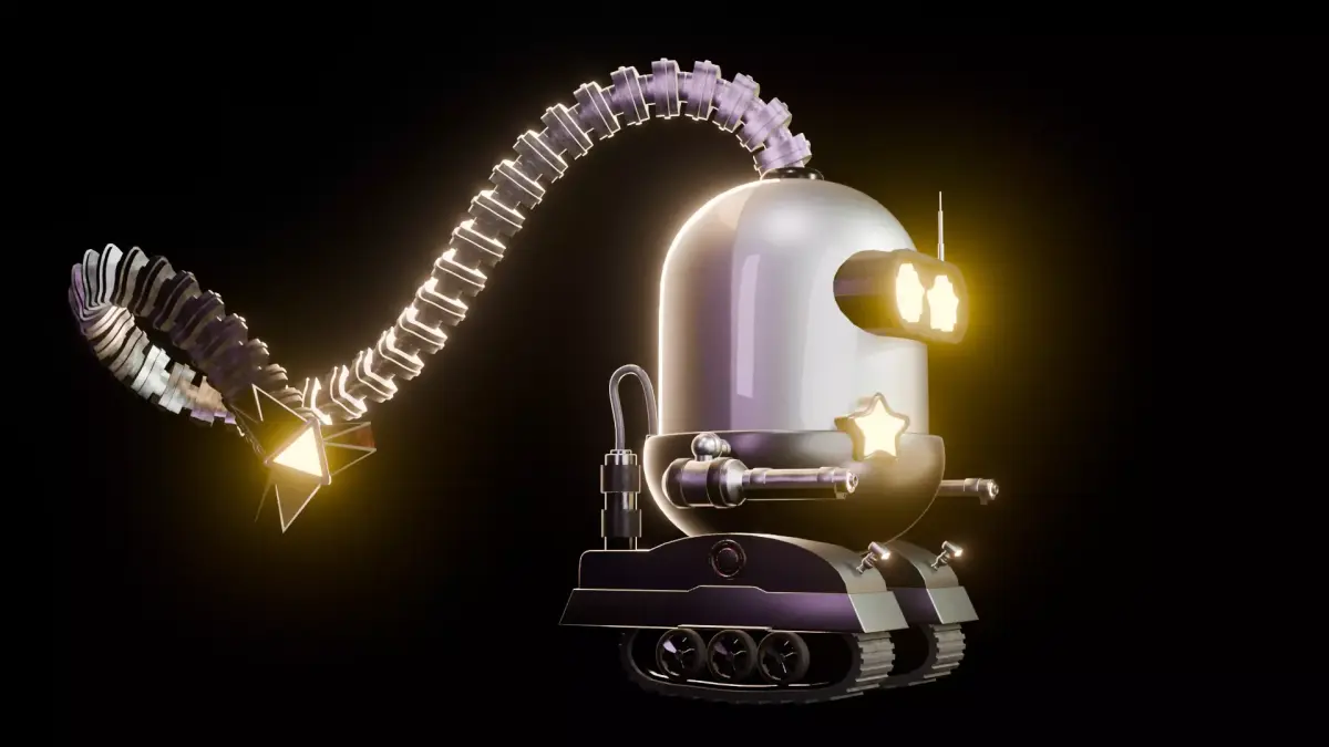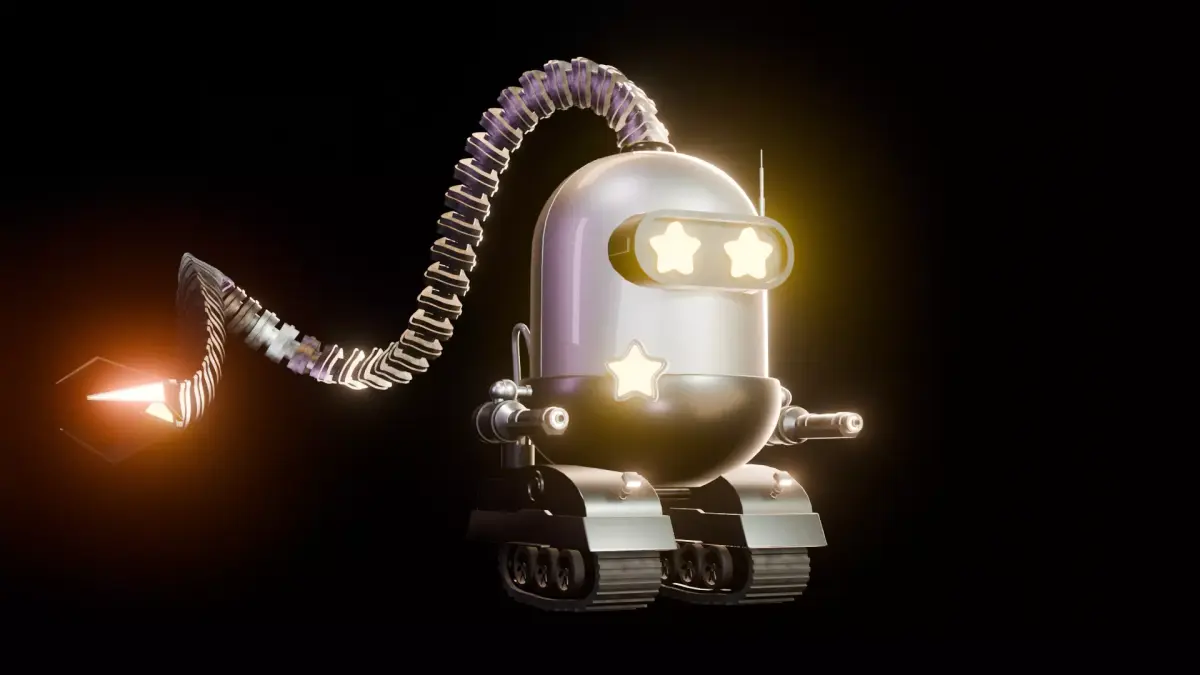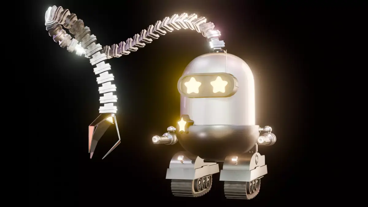 This is a charming, stylized 3D model of a Starlight Bot – a retro-futuristic service or utility robot. Perfect for your game development, animation projects, rendering showcase, or concept art. The model features an iconic, rounded body, glowing star-shaped eyes, and a highly detailed, articulated claw arm manipulator.