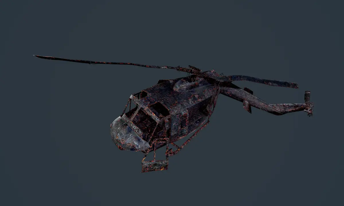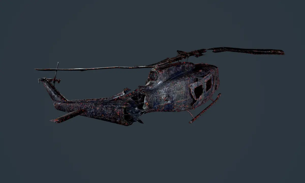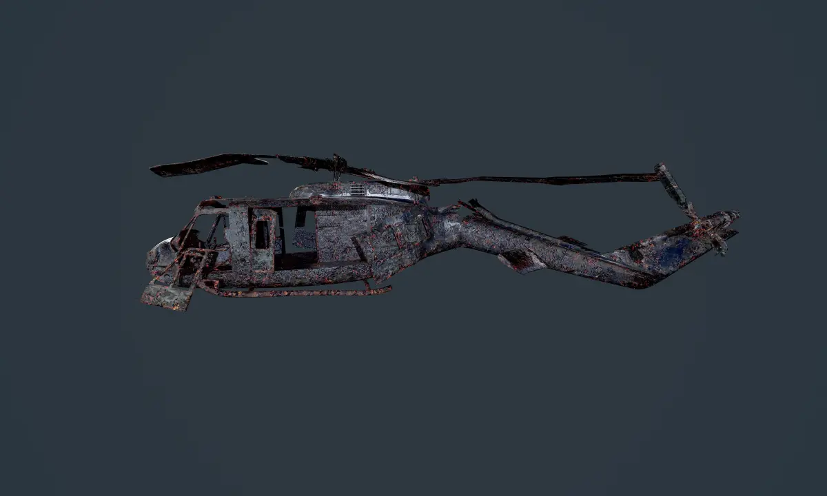 Model of a wrecked UH1H Military Helicopter, unwrapped with PBR textures. OBJ files, 3ds. and FBX files. Ready for use in any 3D software or game engine. Unwrapped: Non- Overlapping