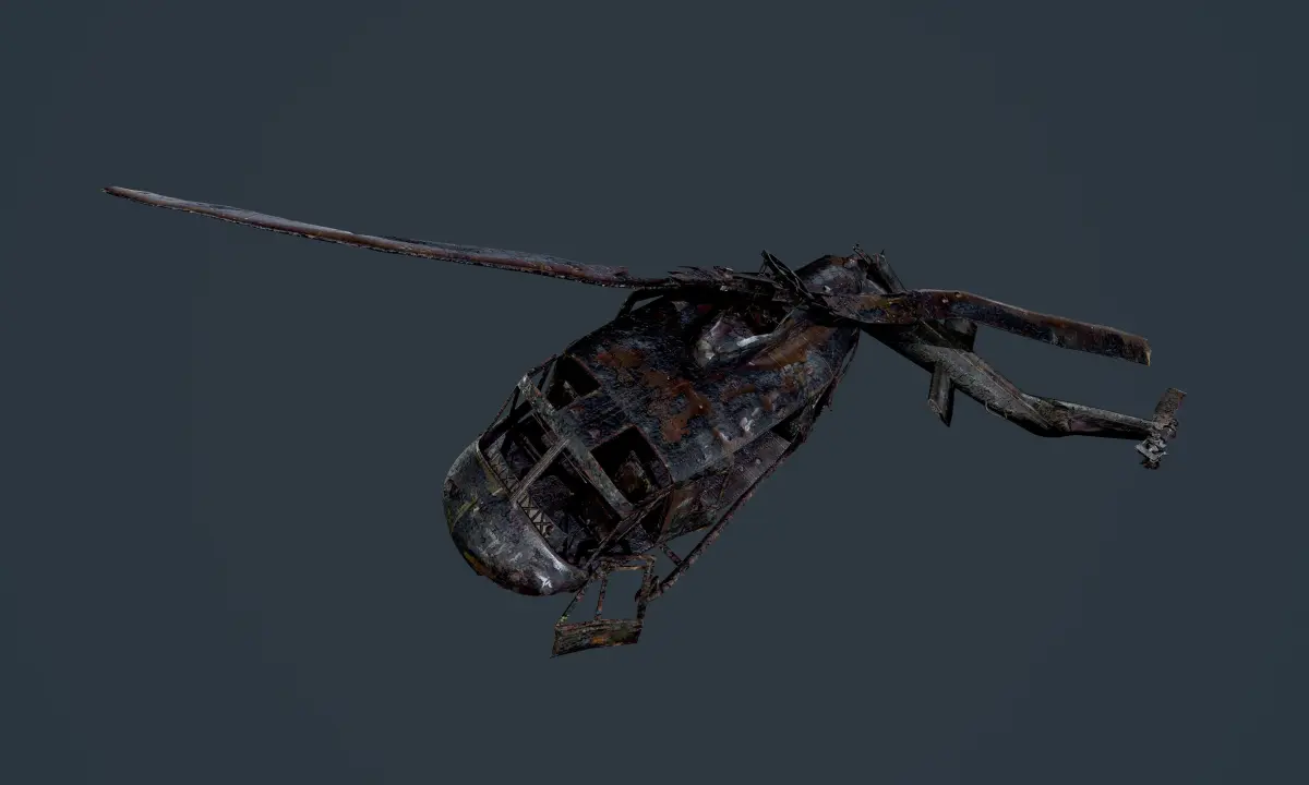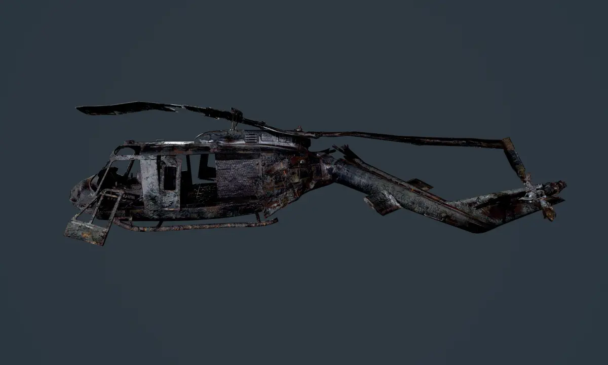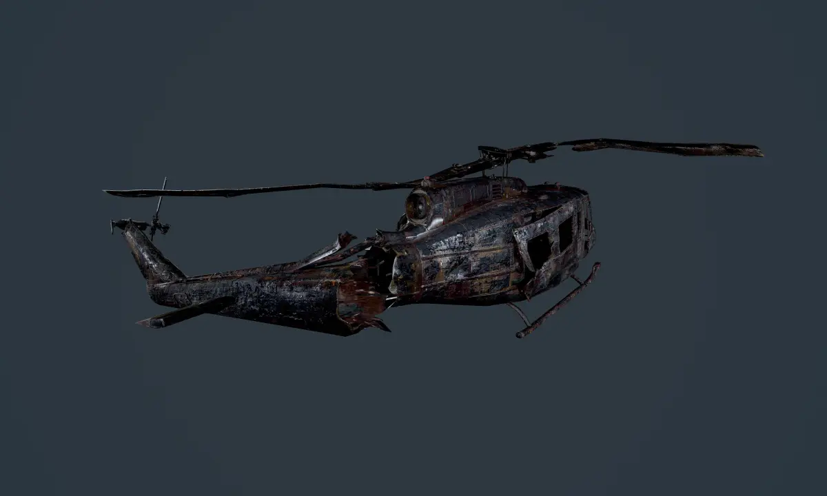 Model of a wrecked UH1H Military Helicopter, unwrapped with PBR textures. OBJ files, 3ds. and FBX files. Ready for use in any 3D software or game engine. Unwrapped: Non- Overlapping