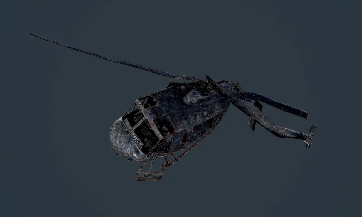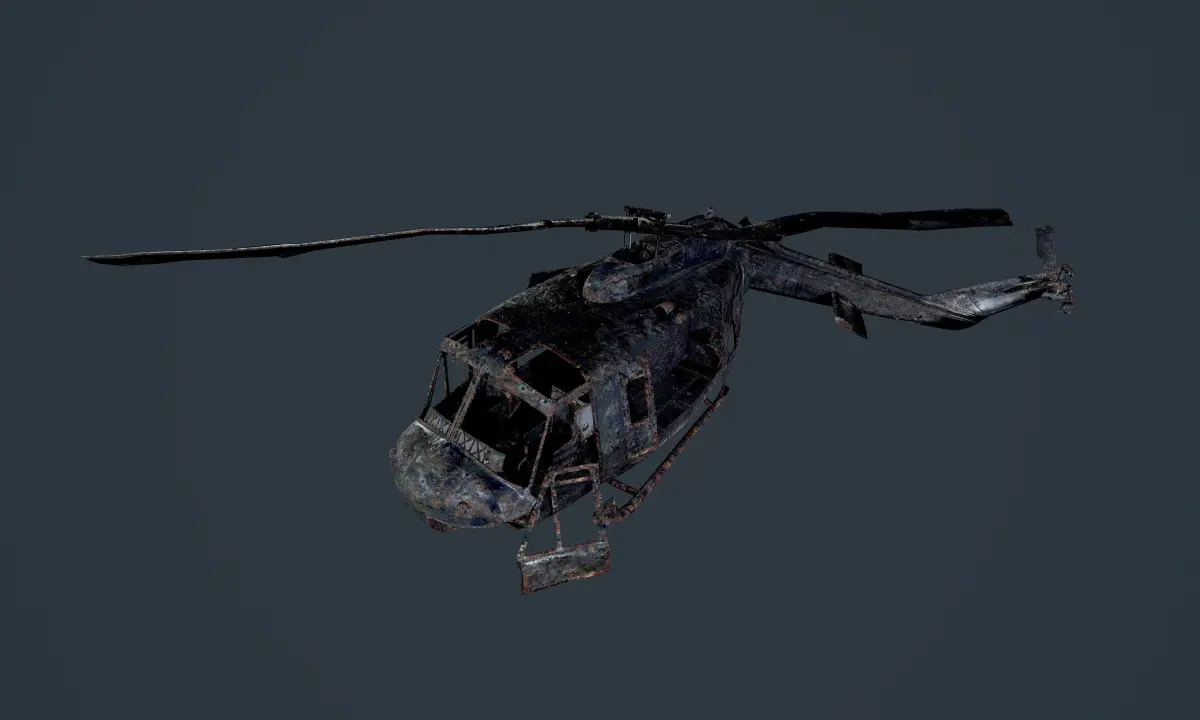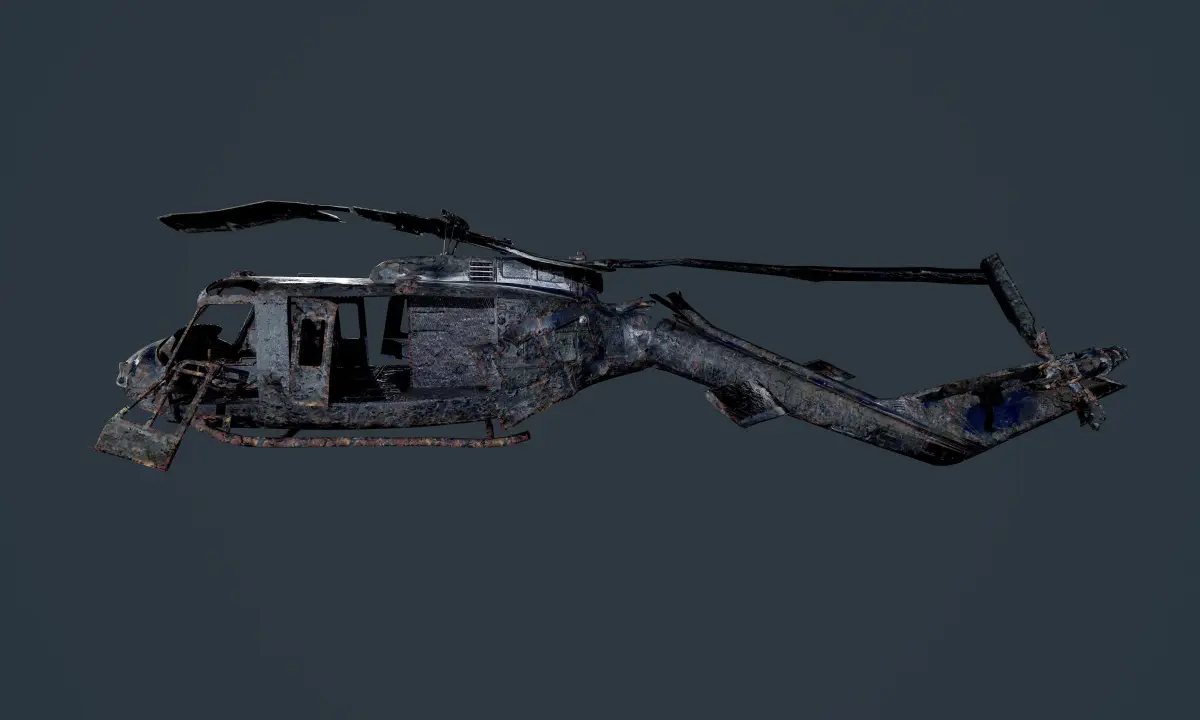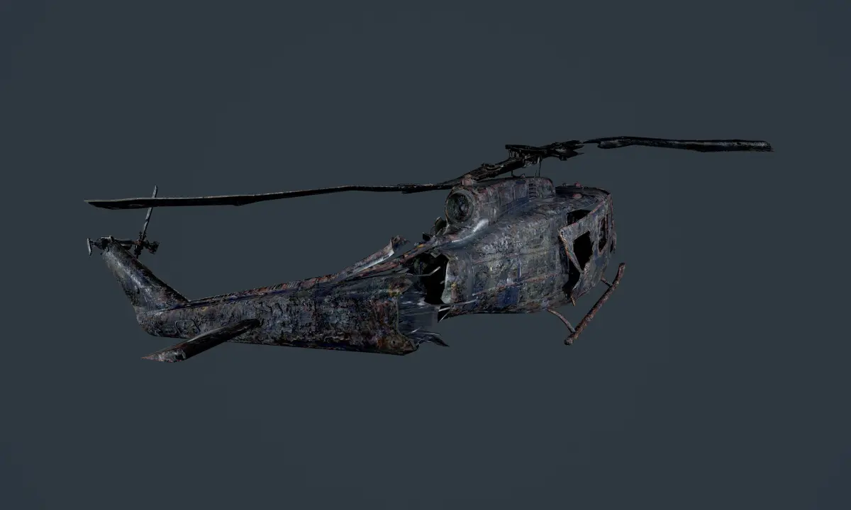 Model of a wrecked UH1H Military Helicopter, unwrapped with PBR textures. OBJ files, 3ds. and FBX files. Ready for use in any 3D software or game engine. Unwrapped: Non- Overlapping
