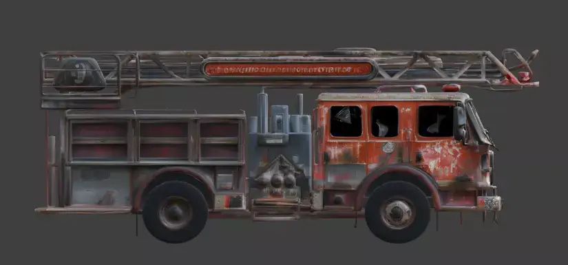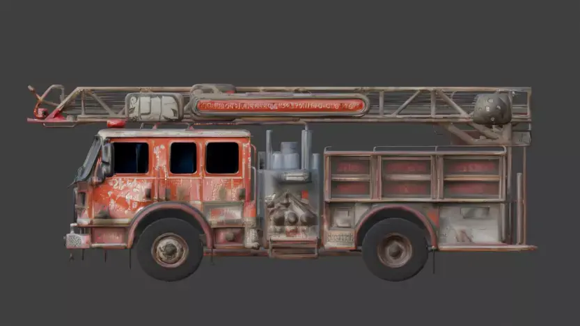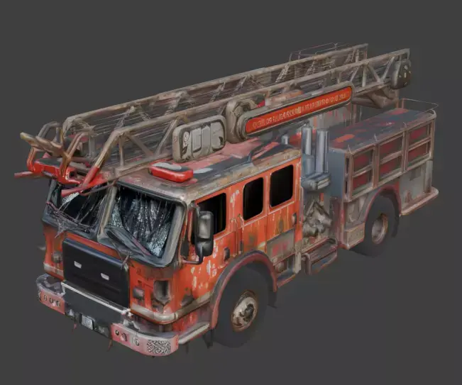 Tags fire-truck, fire-engine, vehicle, wrecked, abandoned, ruined, destroyed, apocalypse, war, rust, ladder, debris, rubble, realistic, wasteland, environment, post-apocalypse, pbr