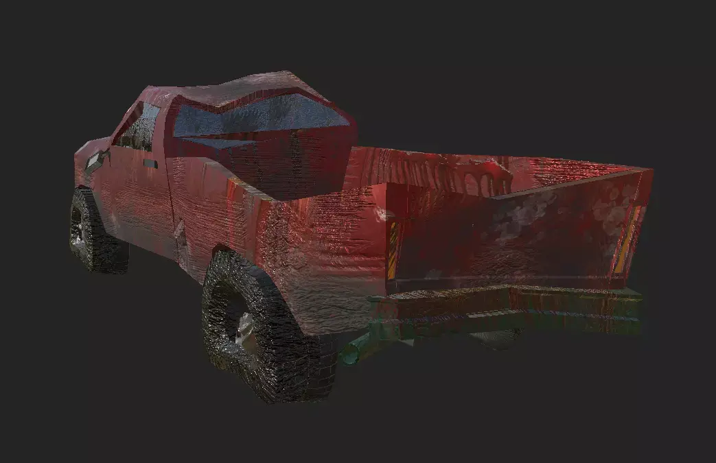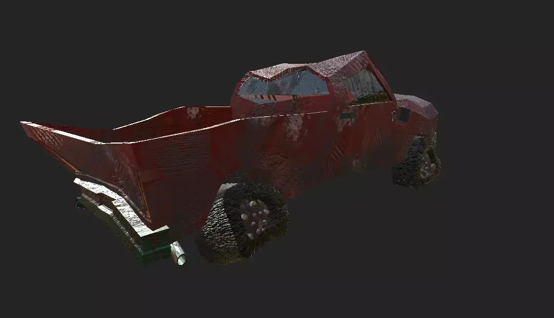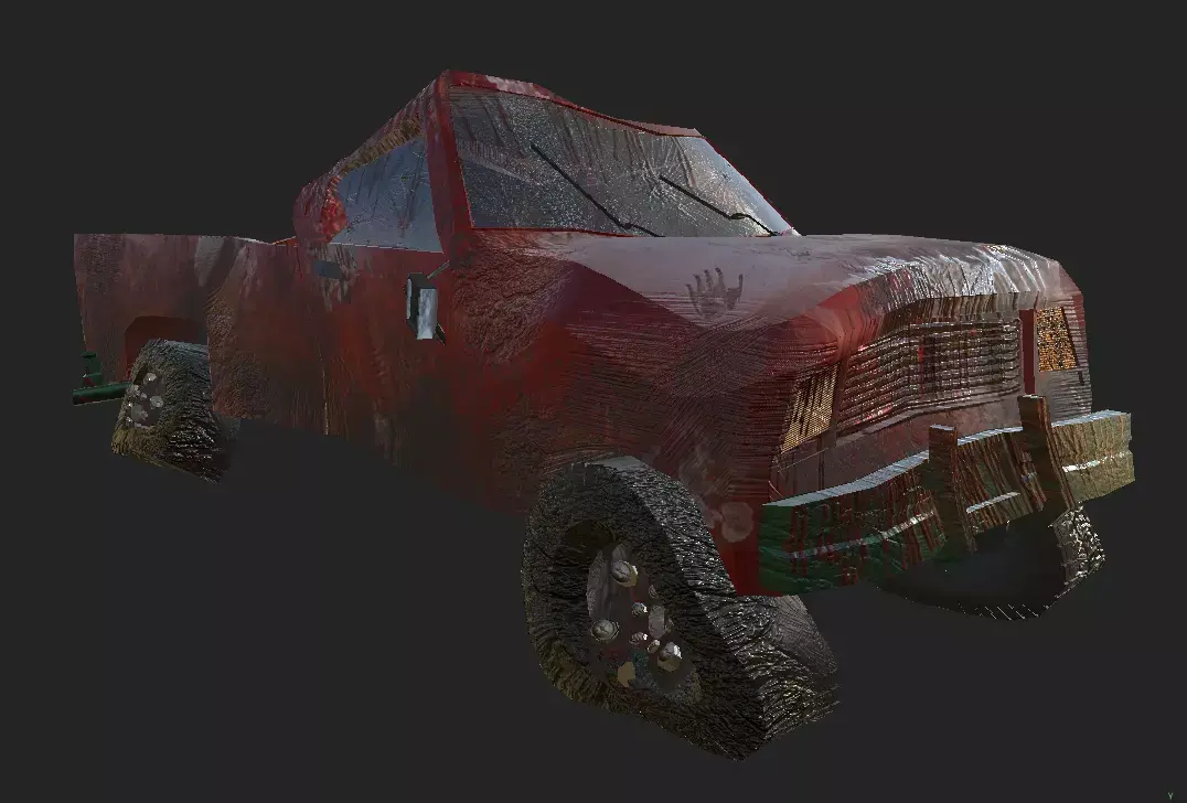 High-quality 3D model of a wrecked pickup truck, designed for horror, post-apocalyptic, or crime-scene projects.