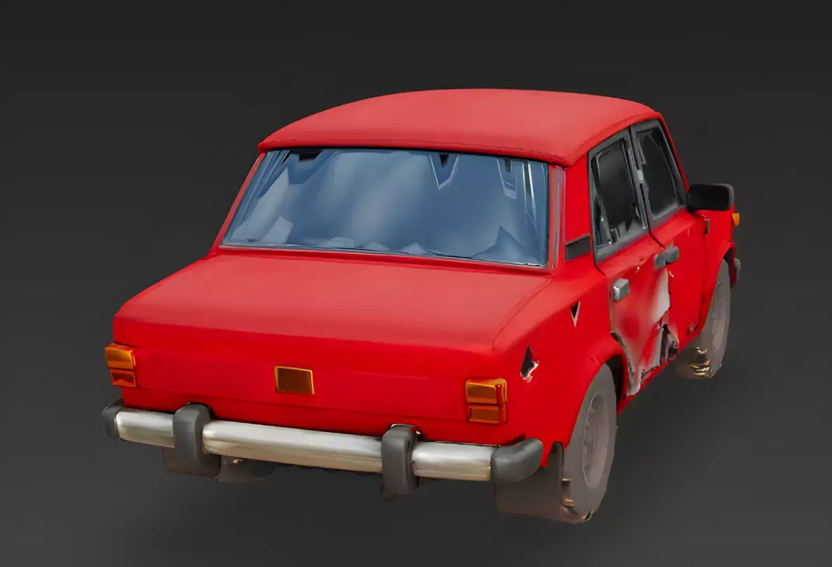 Asset BreakdownThe Overall ConceptThis asset is a stylized, chibi-style commuter sedan designed with a heavily wrecked and derelict aesthetic. It features a compact, boxy silhouette with significant body damage and surface weathering, making it an ideal choice for wasteland survival games, post-apocalyptic urban scenes, or as a background prop in stylized environments.