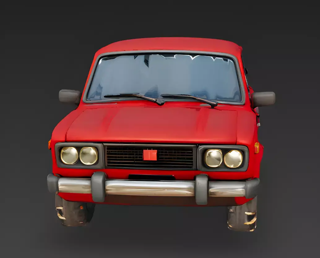 Distressed Matte Red FinishThe vehicle's body is finished in a uniform, matte red paint that shows extensive signs of wear and tear. Large sections of the paint are scratched and dented, providing a high-contrast, battle-worn look that remains consistent with a vibrant, cartoonish art style.