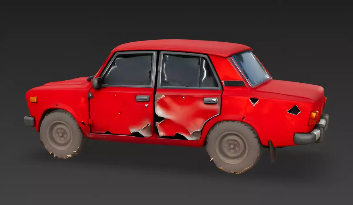 Significant Body Damage and DentsThe model features prominent structural damage, particularly along the side doors and rear quarter panels. The peeling and crumpled metal textures are designed to be bold and visually readable, suggesting a history of high-impact collisions without the use of complex organic elements.