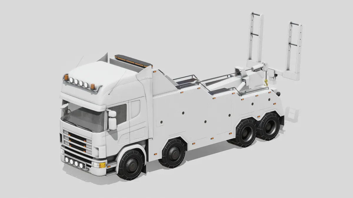 Moving parts like wheels, rotating orange lights, towing/vehicle lifting parts in the rear. Plus the cabin interior, transparent glass parts and snow chains are separate objects. 44 objects in total.