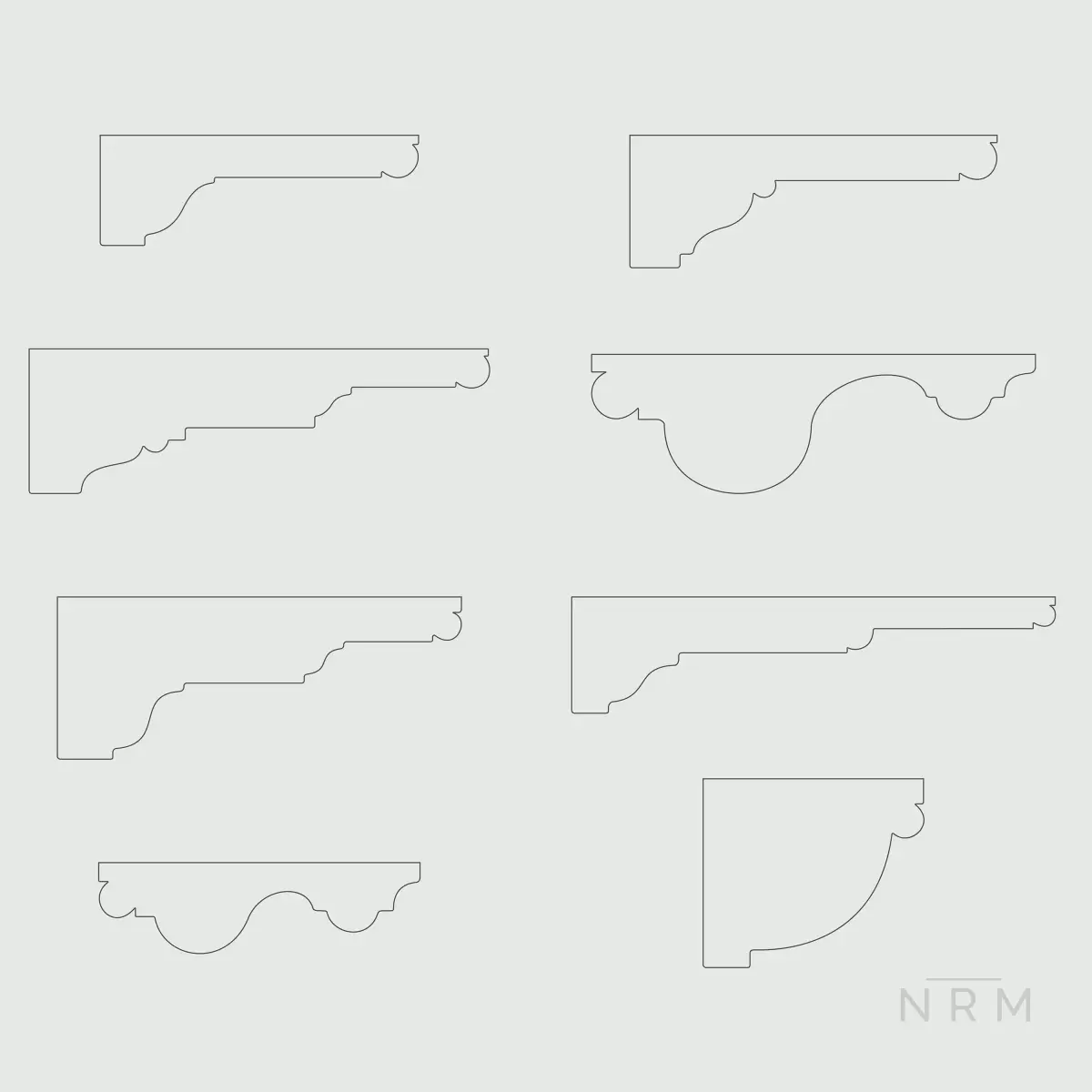A collection of Wren-period architrave profiles, representing early Georgian architectural detailing, recreated from real historic mouldings.