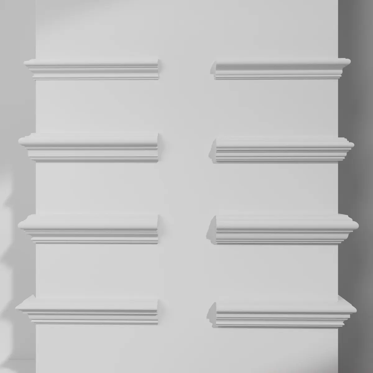 The profiles reflect restrained late-17th-century proportions, suitable for Restoration, Queen Anne, and early transitional Georgian interior schemes. Each moulding has been modelled with accurate scale and clean geometry, making the set appropriate for high-end visualisation, heritage-led projects, and period-correct interior scenes.