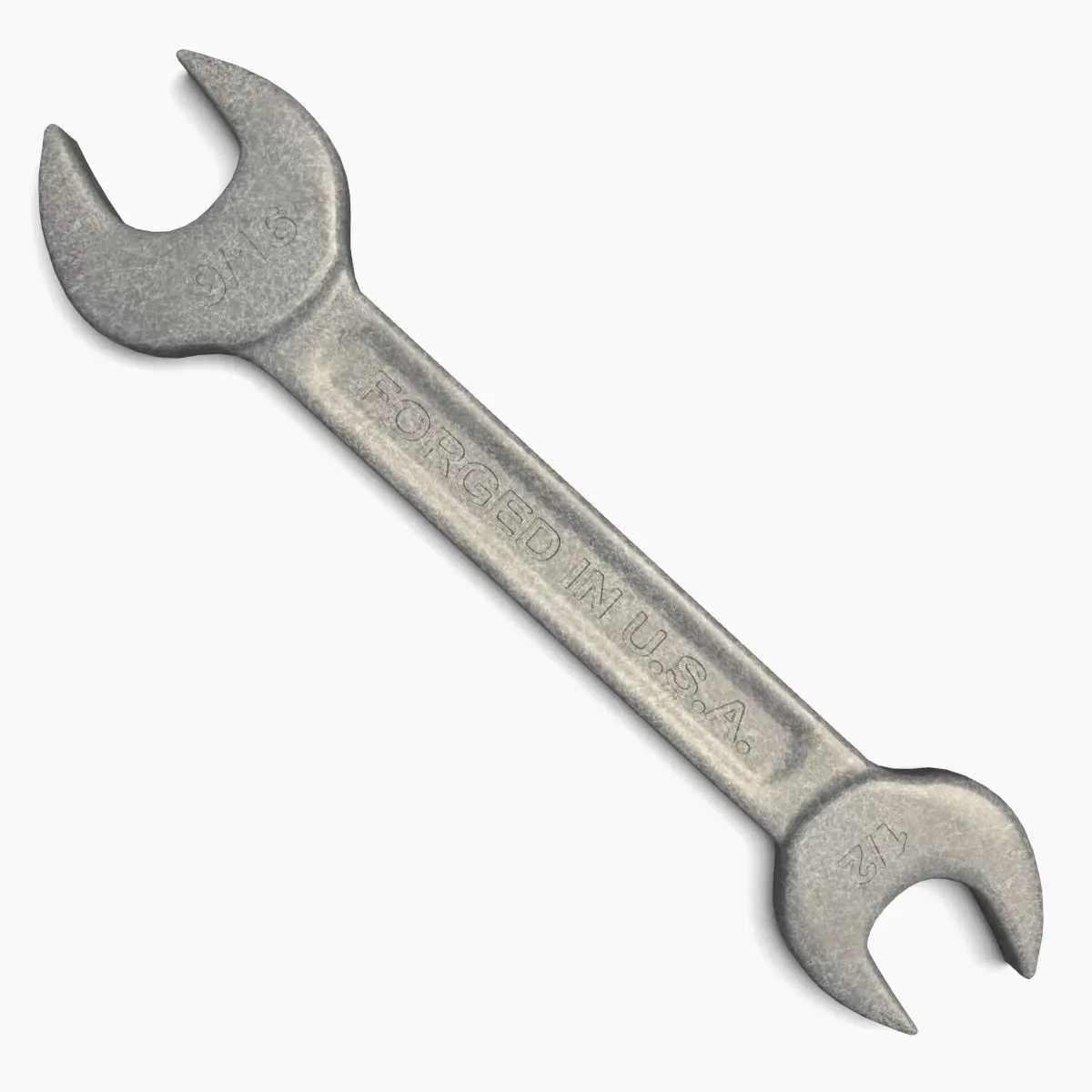 3D model of a wrench modelled in Blender v2.76. The model is completed of materials and textures.Length = 130 mmFirst opening = 9/16 inchSecond opening = 1/2 inchThe text over the tool is made by normal map.You can find the UV Layout in the ZIP - see folder 'UVLayout'.