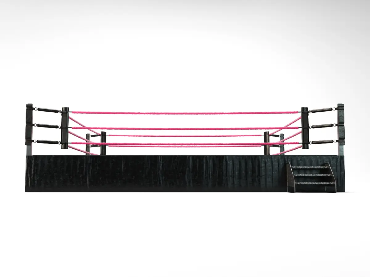 An over sized modern wrestling ring of black surrounded by pink ropes
