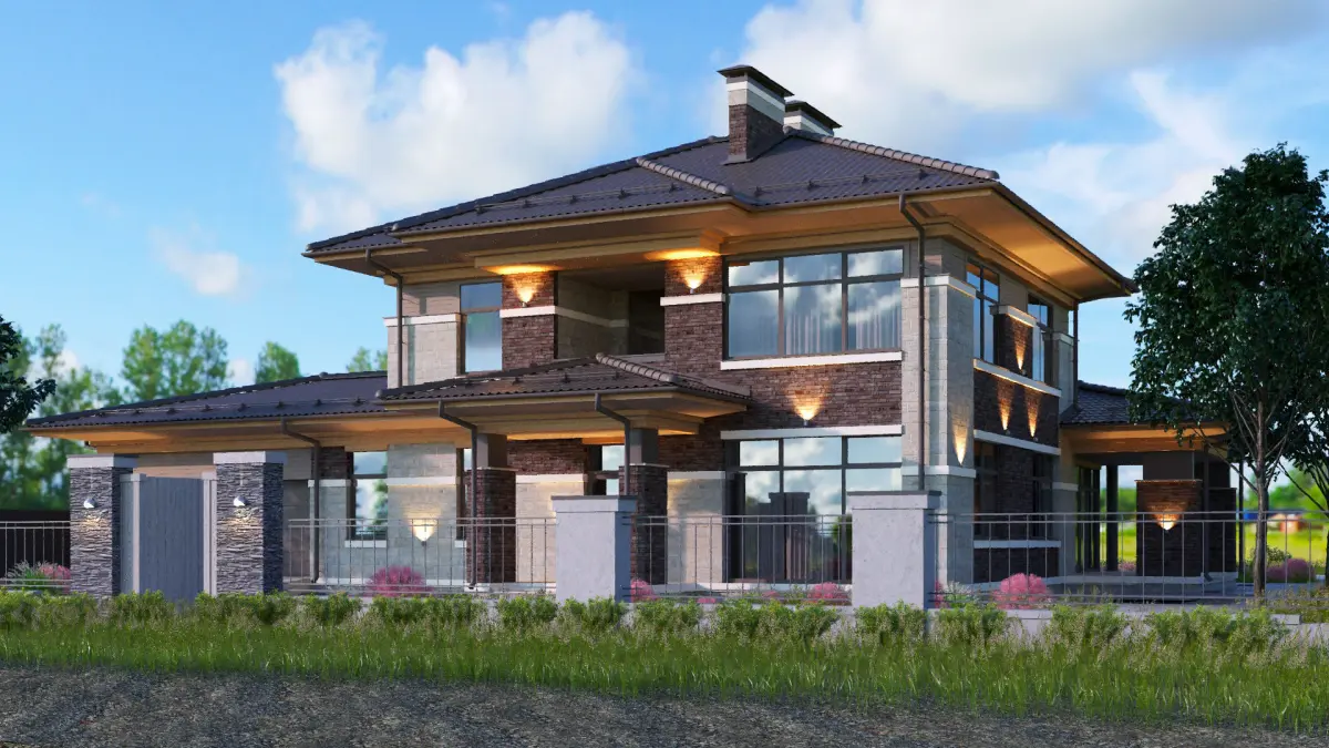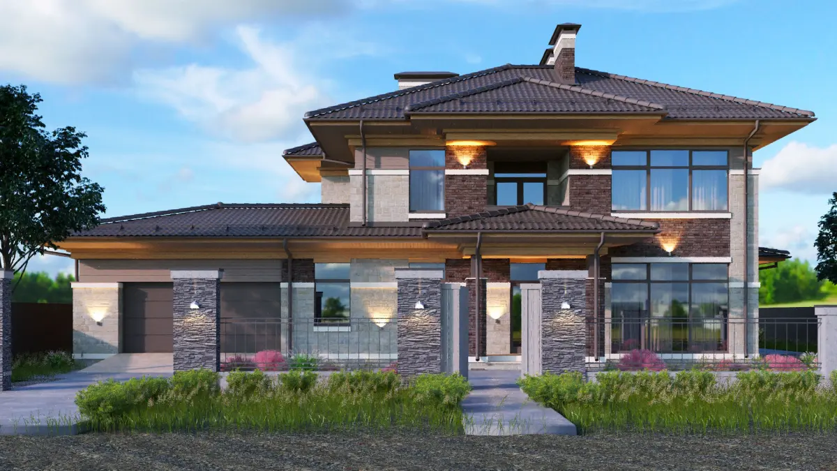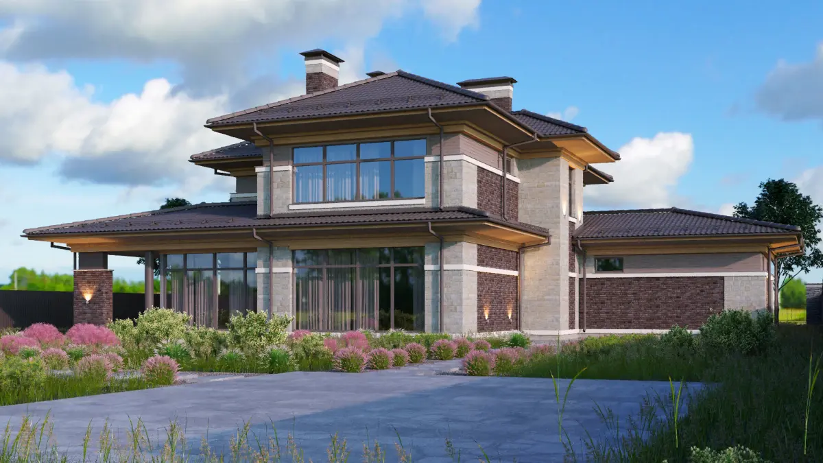 A Wright-style house with a spacious 2-car garage is considered a classic option. The house is actively present a variety of textures in a single color scheme. Panoramic Windows make a comfortable and stylish solutions for interior. The house has brick or stone walls, not frame ones. The roof is covered with metal tiles. Although it is possible to apply for the Wright style and seam roof. For more information about the project of the house and its detailed description, follow the link - https://zen.yandex.ru/media/id/5daf543b118d7f00c3033eca/svetlyi-jenskii-rait-220-m2-s-4-spalniami-s-terrasoi-i-garajom-na-2-mashiny-35-m2-5f3cecacb81fca42036da8d5