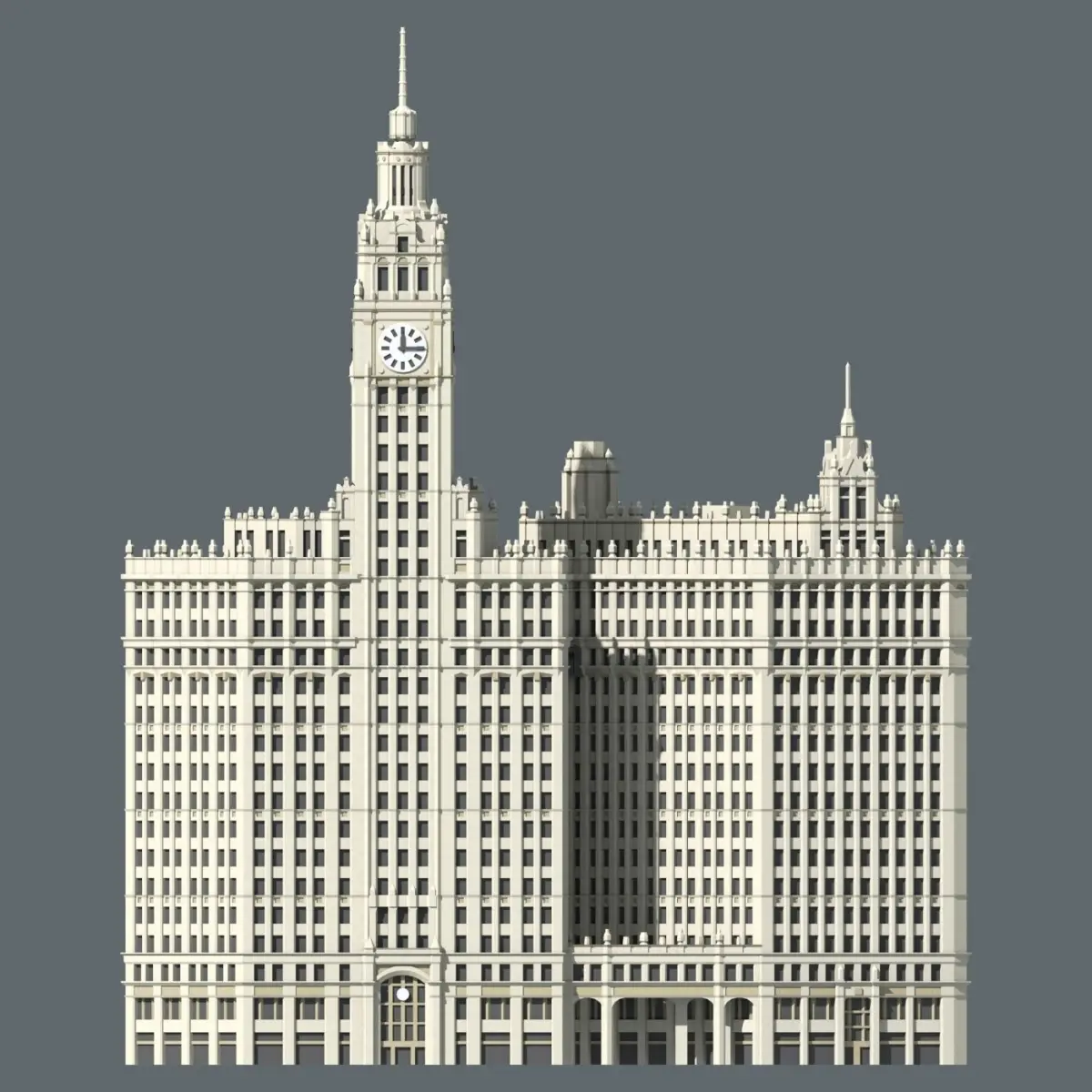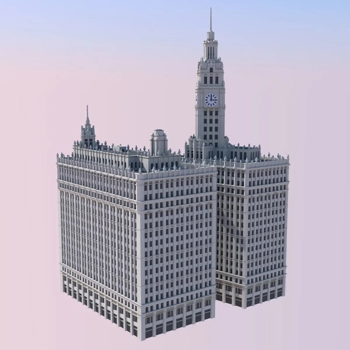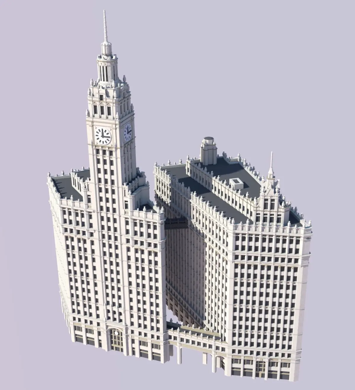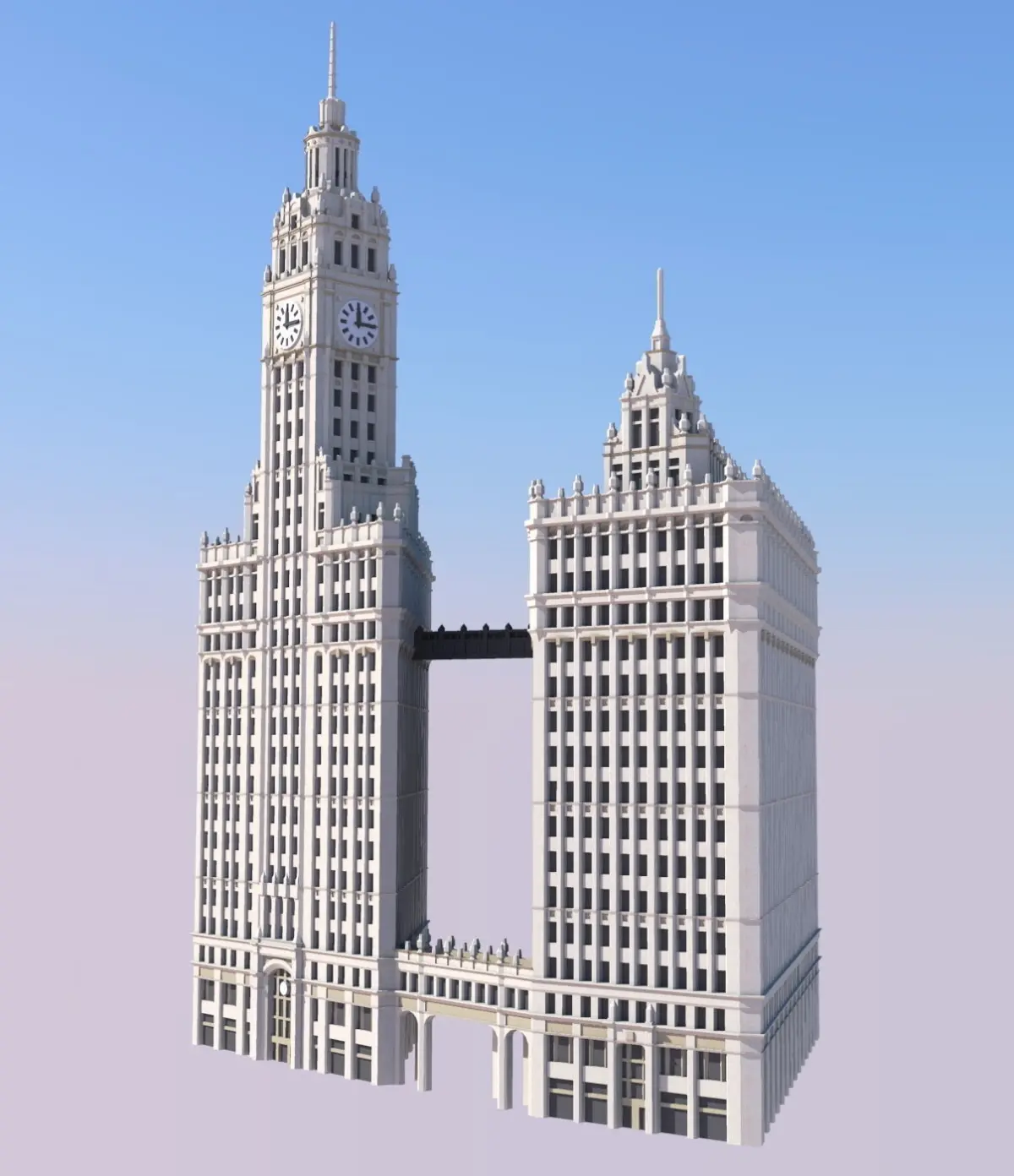 The Wrigley Building is a 438ft (133.5m) tall skyscraper in Chicago, Illinois. Prominently located on the northern side of the Michigan Avenue Bridge, the Wrigley Building is one of the city's most famous and celebrated building. Commissioned by the Wrigley chewing gum company, the pair of buildings were constructed in two phases. The southern building, with its magnificent clock tower, was constructed first in 1921. Shortly afterwards, a matching northern building was completed in 1924. The two buildings are joined by a decorated archway at the ground level and 3rd floor, as well as by a suspended bridge on the 14th floor.The buildings were designed by prominent Chicago-based architectural firm Graham, Anderson, Probst & White in a stlye reminiscent of Spanish cathedrals mixed with various Renaissance-inspired ornamentation.
