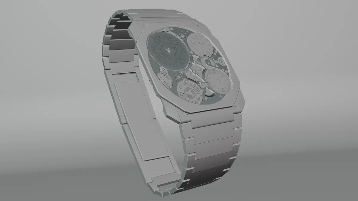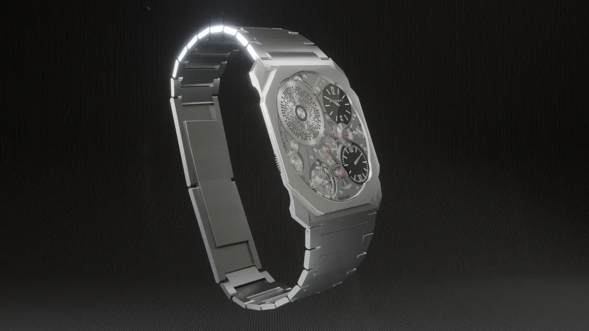 This is a detailed 3D model of the Octo Finissimo Ultra watch, created in Blender with precision and attention to detail. The watch body and face are accurately modeled, capturing the sleek and ultra-thin design.