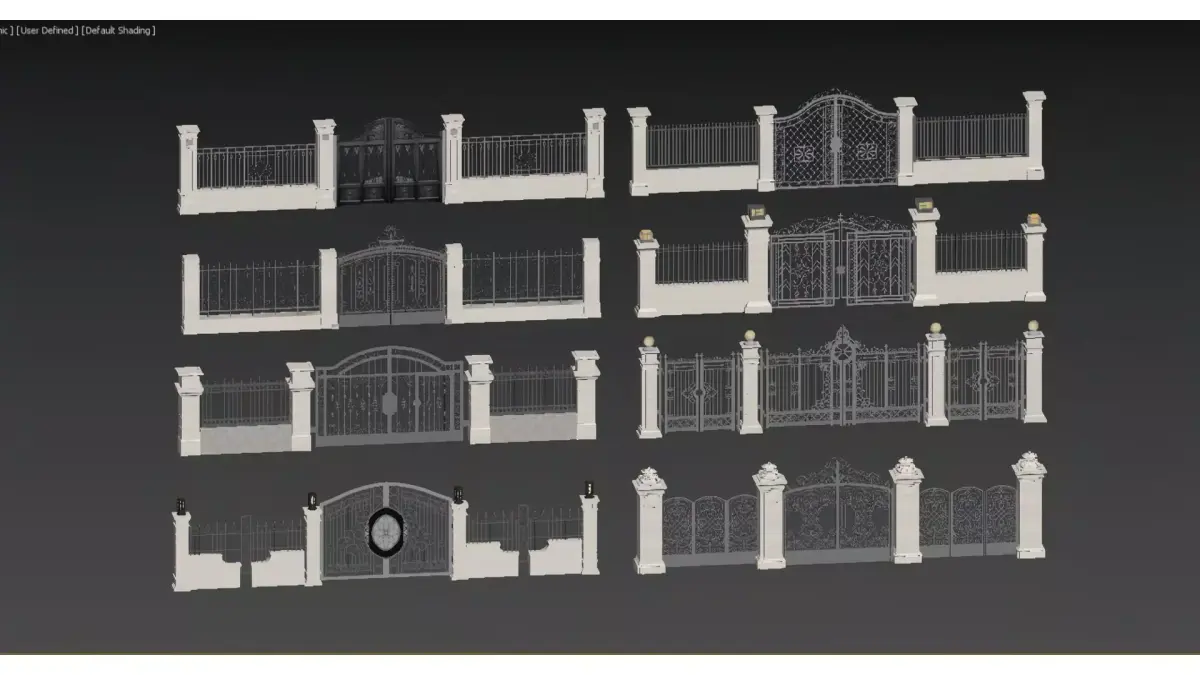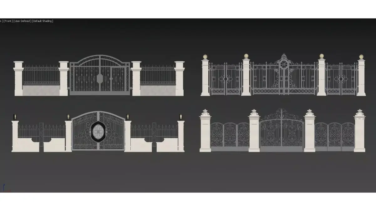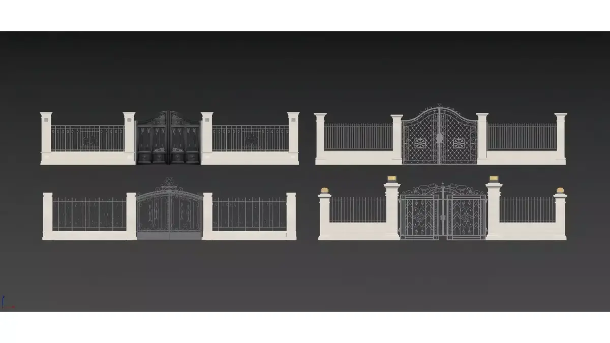 This is a set of design for European-style villa gate and wall combination, featuring a frame of off-white stone columns and plinths, matched with black wrought iron carved gates and railings.The design integrates classic patterns, geometric lines and exquisite decorations, boasting both aesthetic appeal and security. Suitable for villas, mansions, high-end courtyards and other scenarios, it presents a solemn and elegant visual effect.