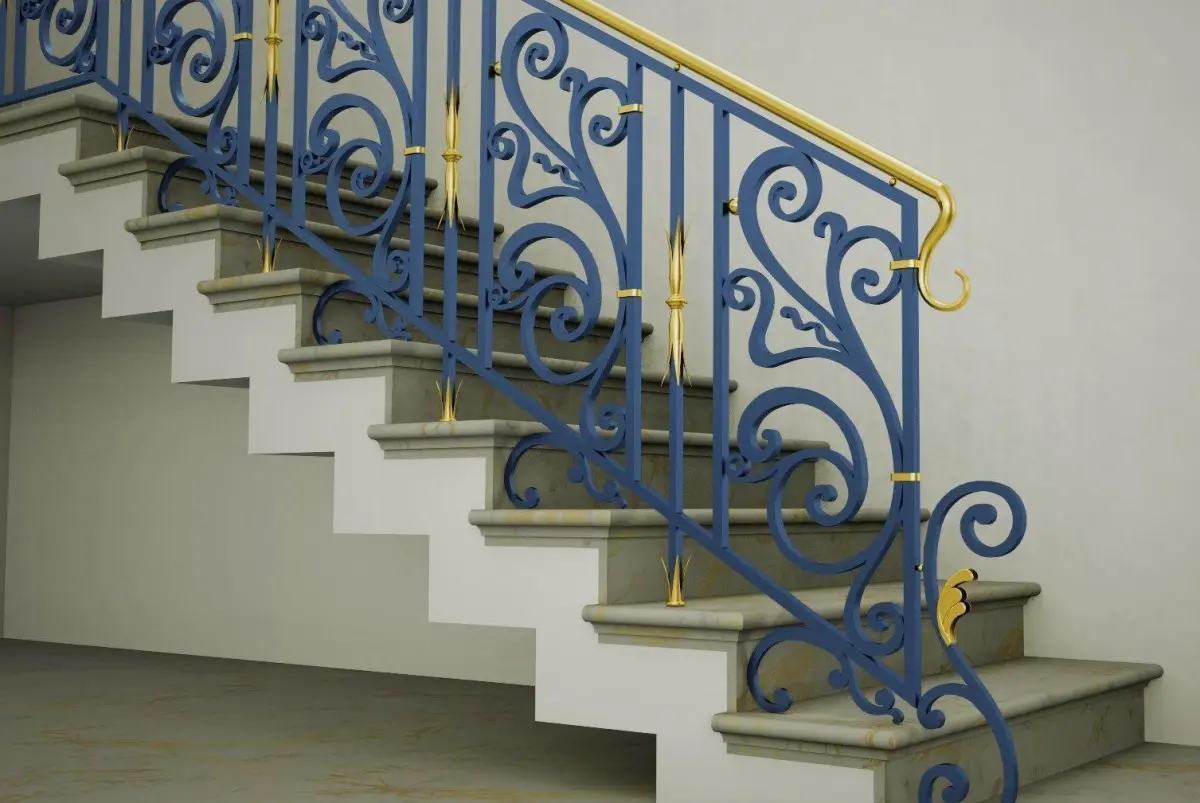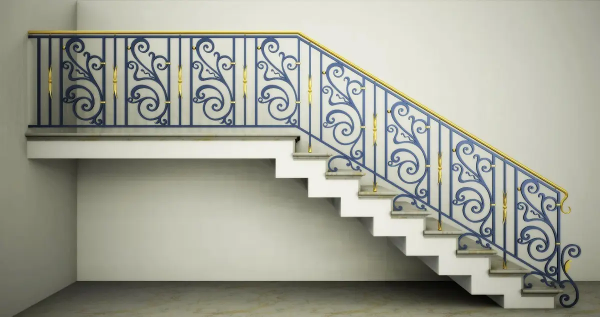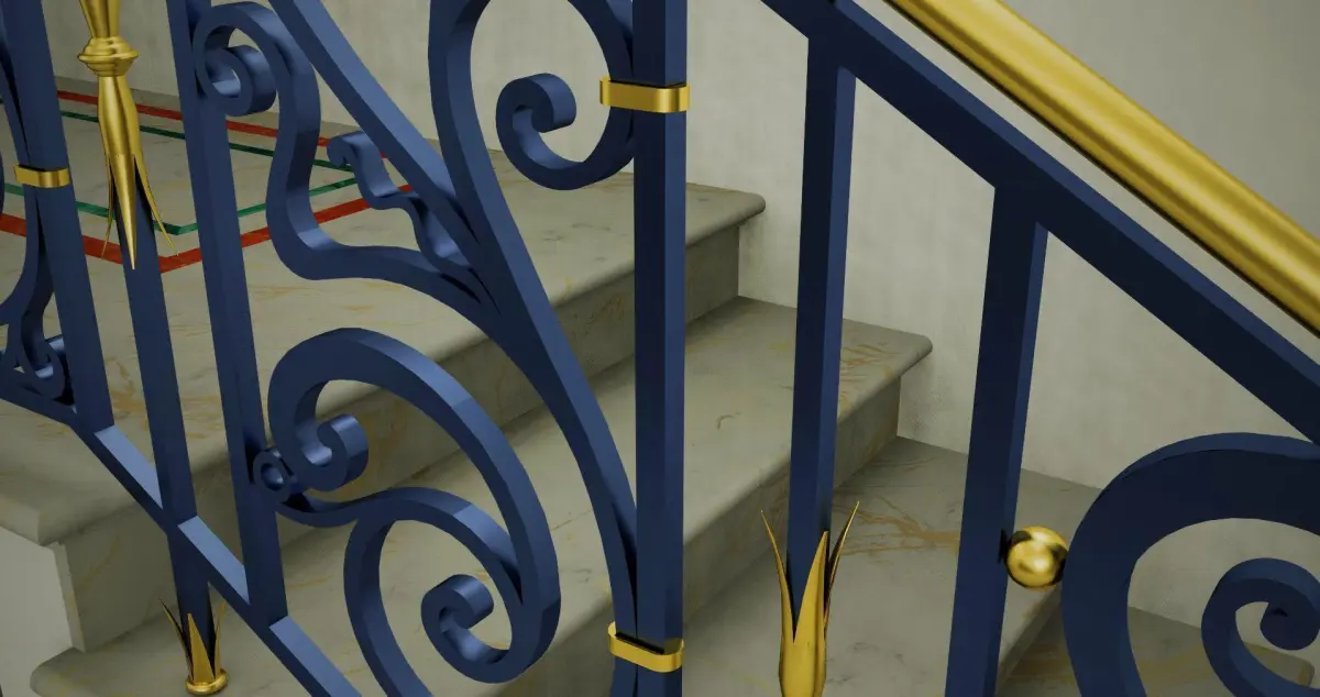 A wrought iron handrail with brass decorations in dwg, stl and iges format