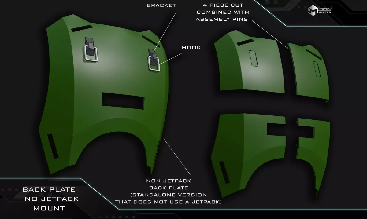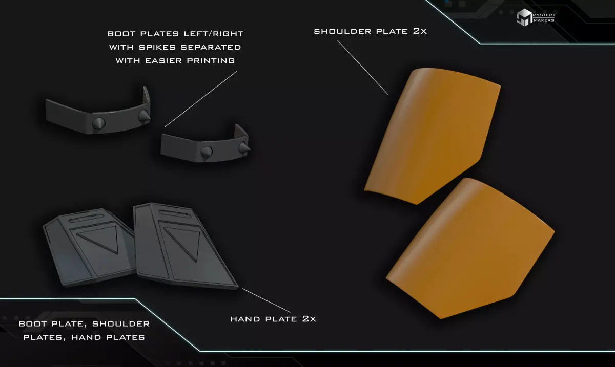 Helmet4 grav charges that light upBack plate (standalone version – for display or without jetpack)Back plate BOBF version – compatible with JJ Industries jetpack mountsJetpack (BOBF compatible, with new WW2-style details)Hand platesShoulder platesChest plate (split for easier printing and assembly)2 belt buckles – Empire and Mythosaur versionsKnee platesBoot platesVambrace/flamethrower with snap-lock systemJoin our community and find out more at:https://www.facebook.com/groups/3282336185171090
