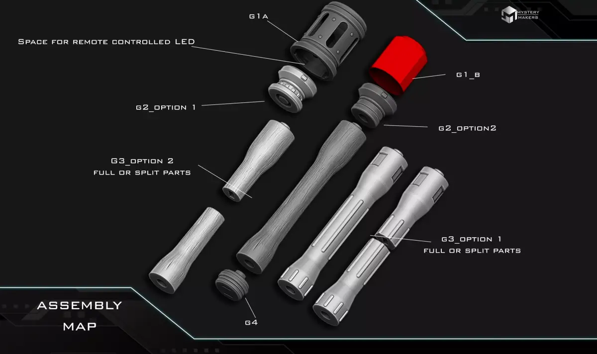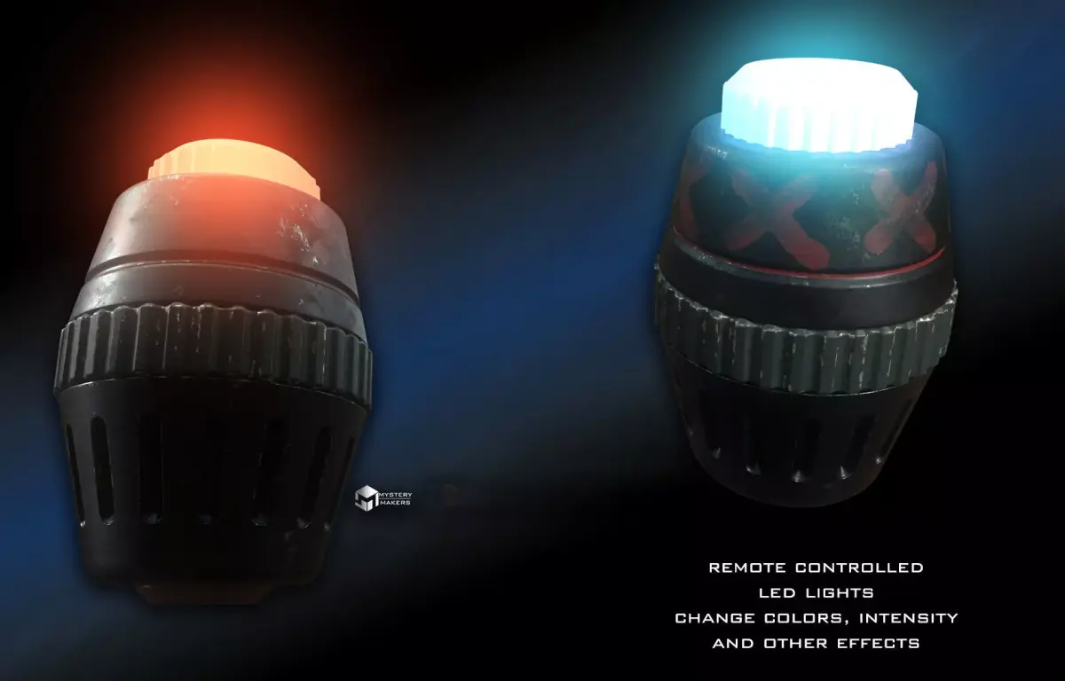 I designed them to keep that old military aesthetic, but gave them a bit of a futuristic twist inspired by Mandalorian grav charges. And yes — they all light up, using the same LED setup I’ve used before in the wizard staffs and holopuck projects, so no new parts are needed. You should already have everything you need to make them work. So you can turn them on/off remotelly, change colors, pulsing effects and so on and on :)