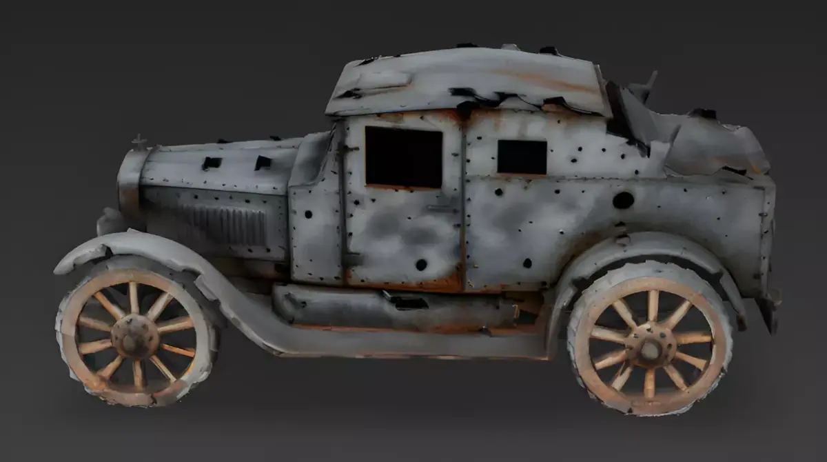 Asset BreakdownThe Overall ConceptThis asset is a highly detailed, 3D-modeled realistic WWI armored car scrap designed as a dilapidated and combat-destroyed environmental prop. Focusing on high-fidelity environmental storytelling through extreme material decay and ballistic damage, this model features life-like scale and a heavily ravaged aesthetic, making it an ideal choice for historical battlefield wreckage, desert wasteland levels, or as a primary landmark in realistic 3D games.