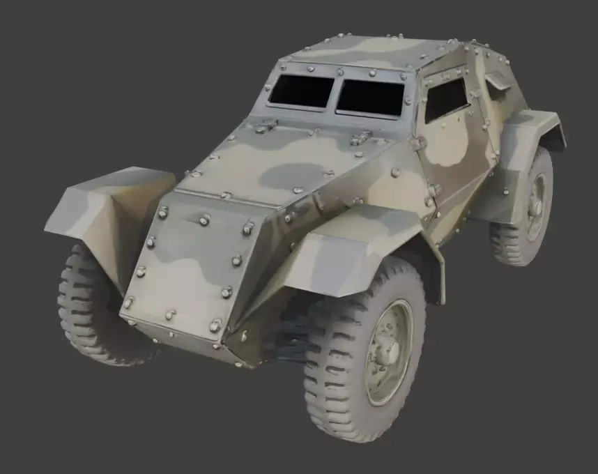 A realistic 3D game asset of a WWII-era Armored Reconnaissance Car, featuring a sloped, four-wheeled armored hull design.