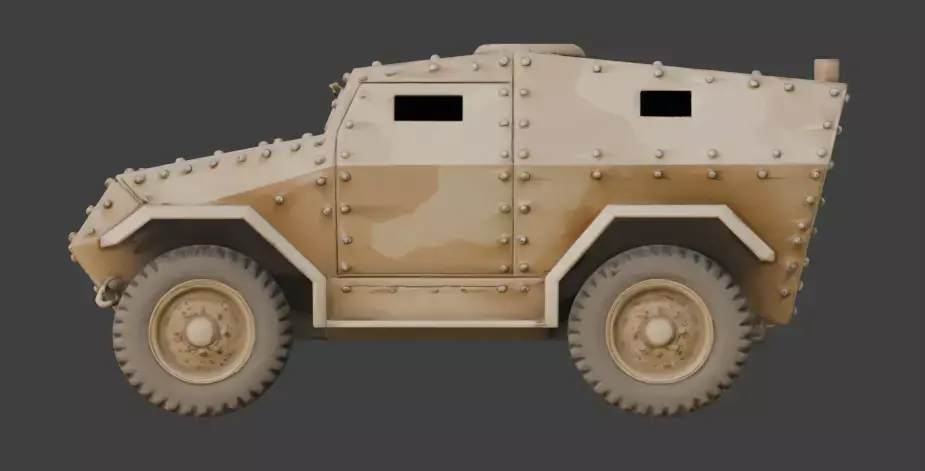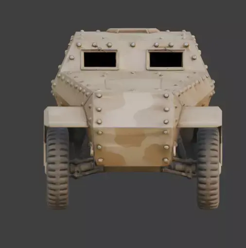 A realistic 3D game asset of a WWII-era Armored Reconnaissance Car, featuring a sloped, four-wheeled armored hull design.