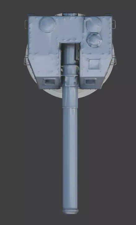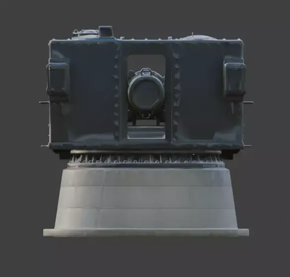 The model showcases a heavily armored steel turret with visible rivet detailing, mounted on a solid concrete circular pedestal.