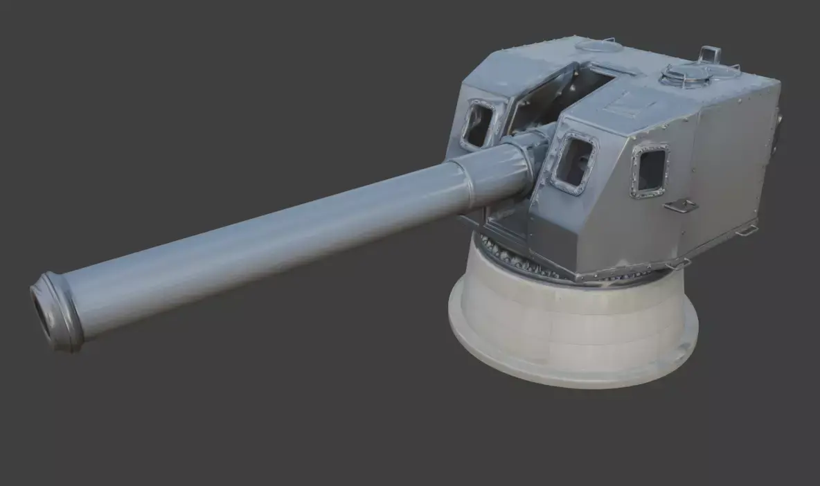 A realistic 3D game asset of a massive WWII-era Coastal Defense Battery, featuring a large-caliber long-range artillery gun.