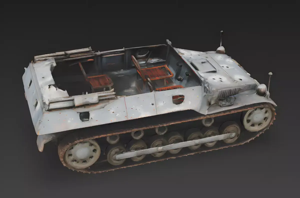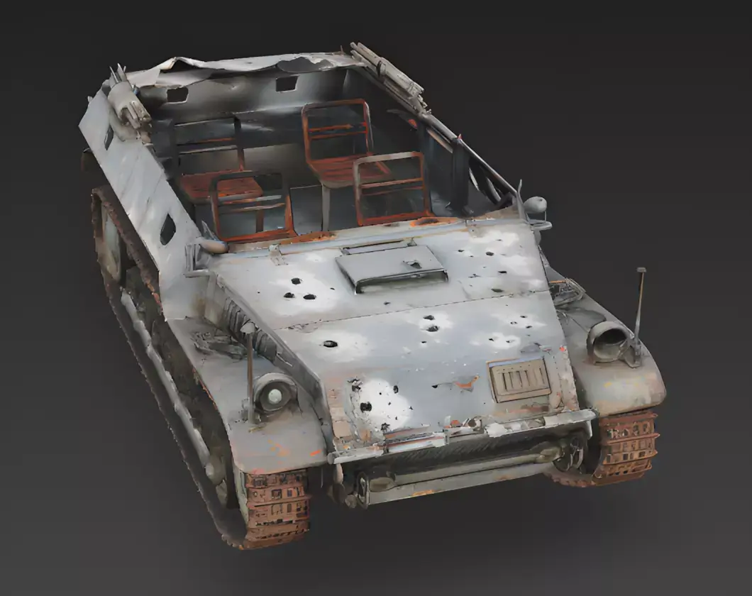 Asset BreakdownThe Overall ConceptThis asset is a highly detailed, 3D-modeled realistic WWII German half-track wreck designed as a dilapidated and combat-destroyed environmental prop. Diverging from functional vehicle models, this asset focuses on environmental storytelling through extreme damage and decay, making it an ideal choice for battlefield wreckage or as a primary environmental prop in realistic 3D games.