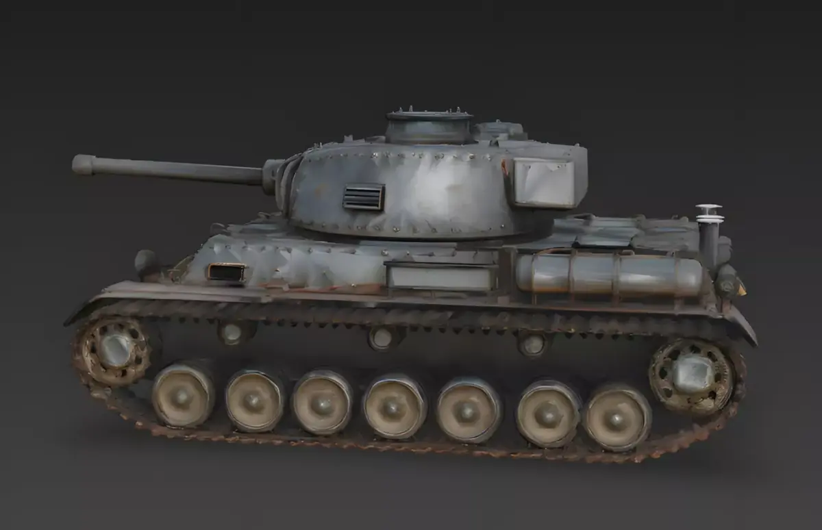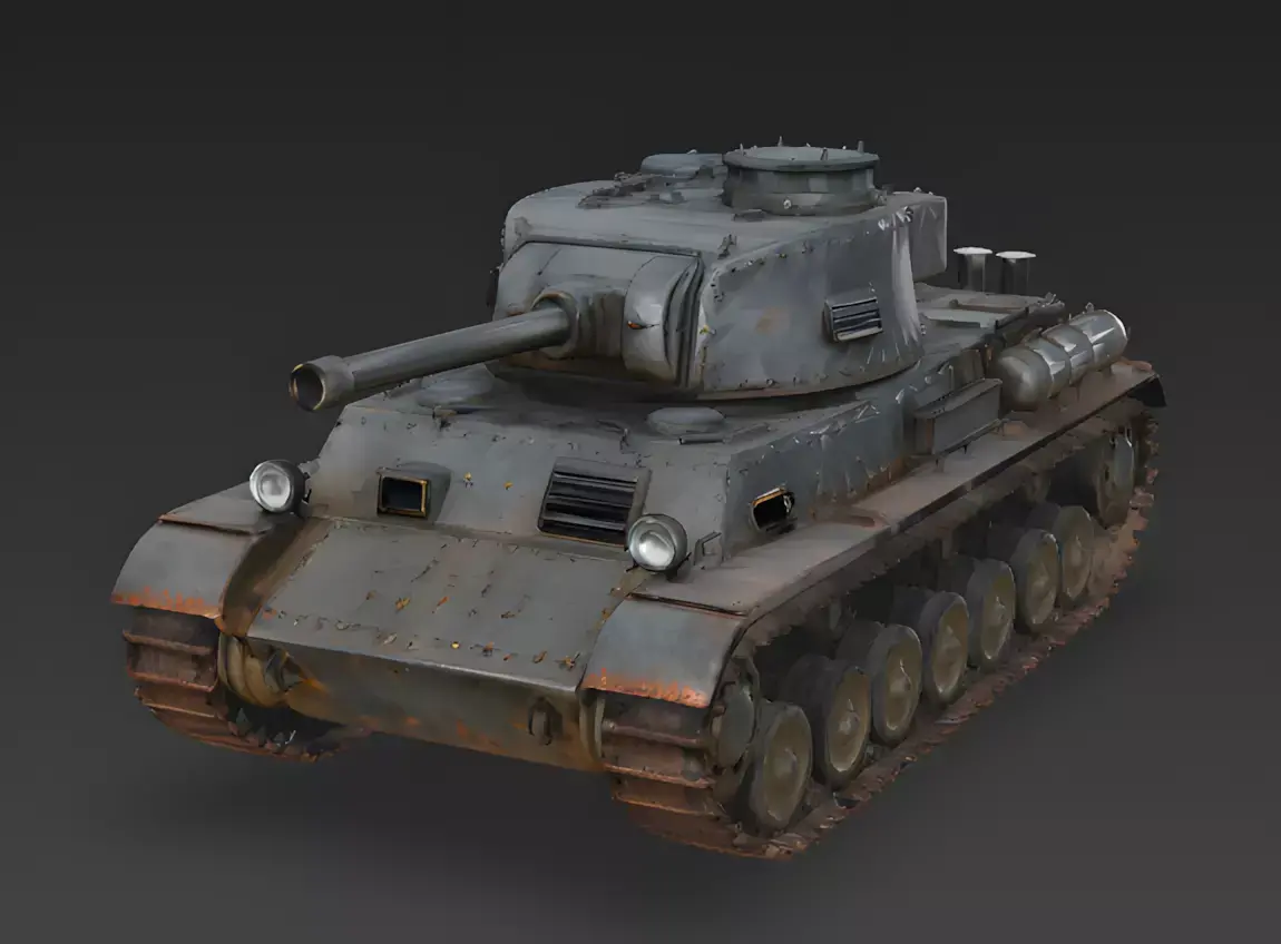Extensively Weathered Steel FinishThe entire tank is finished in a uniform, matte gunmetal-grey texture heavily layered with realistic orange surface rust, metallic scuffs, and accumulated field grime. This grounded and high-fidelity palette emphasizes the model's thick, riveted armor plating and provides a professional appearance that tells a clear story of prolonged operation in harsh battlefield conditions.