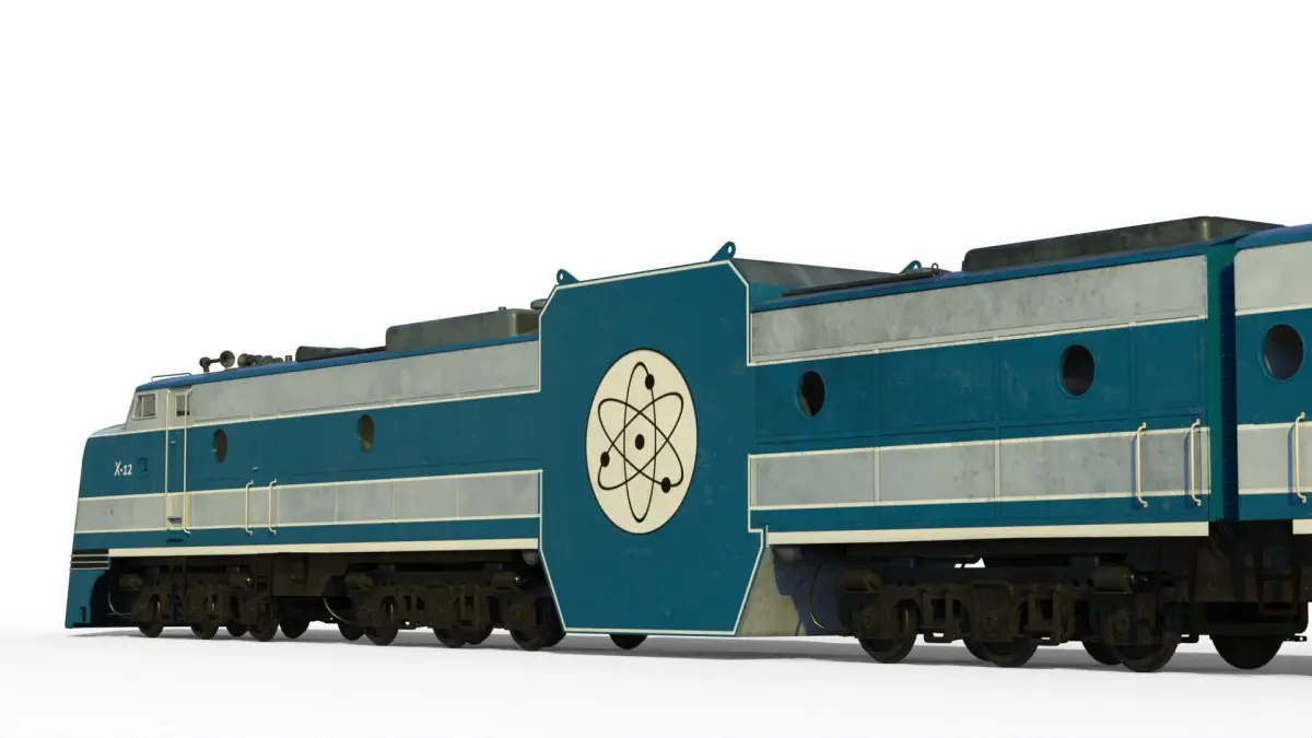 X-12, this concept was created by Dr. Lyle Borst and his physics students at the Univeristy of Utah after consulting the Association of American Railroads and a dozen different companies. As big as the largest steam engine, the two-sectioned X-12 would be 160 feet long, would be powered by a steam-generating atomic reactor in a 200-ton shield to contain its intense radiation. The whole engine would weigh a massive 360 tons, and its wheels would be driven by electric motors. The reactos itself, designed by Babcock & Wilcox Co., consists of a cylindrical tank three feet in diameter and a foot long, filled with a solution of fissionable U0235. As the control rods are withdrawn, chain reaction in the uranium heats the solution to 460°F. Water piped into thousands of tubes running through the cylinder is turned to steam by reactor's heat. After passing through a moisture trap the steam goes on to turn the turbine, which drives four electric generators, two on each side of the reactor shield, producing 7,000 hp. On leaving the turbine the steam is reconverted to water by a condenser, then flows back to the reactor once more. Since a second water system is necessary to cool the condenser, Dr. Borst's design calls for a 65-foot radiator car behind the locomotive.