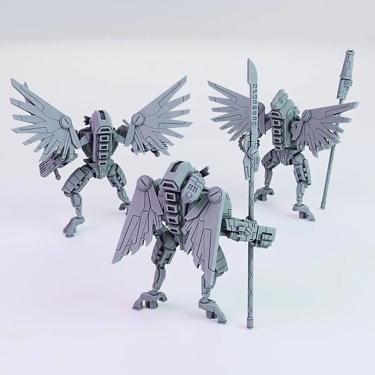 Included are all the STLs needed to print your custom XE7 Battlesuits with custom loadouts. There are three head options, three wing options and four hand options. All shown weapons are included as well.The Battlesuits have four hardpoints on their arms and can wield staff weapons in their hands. Two bits on the Jumppack can be exchanged for two additional hardpoints.