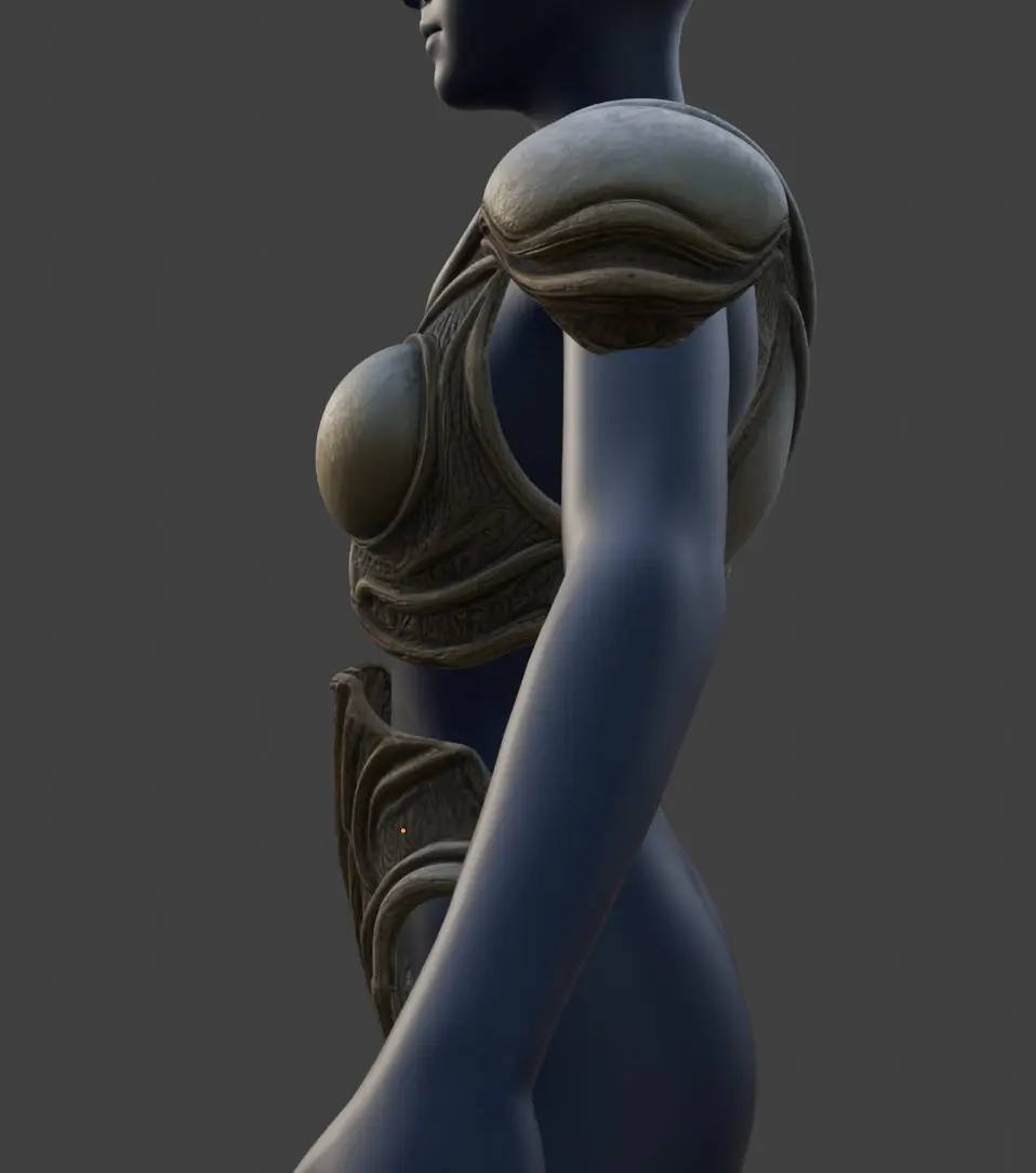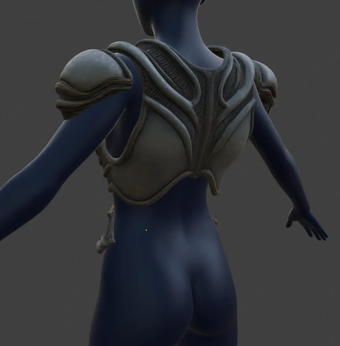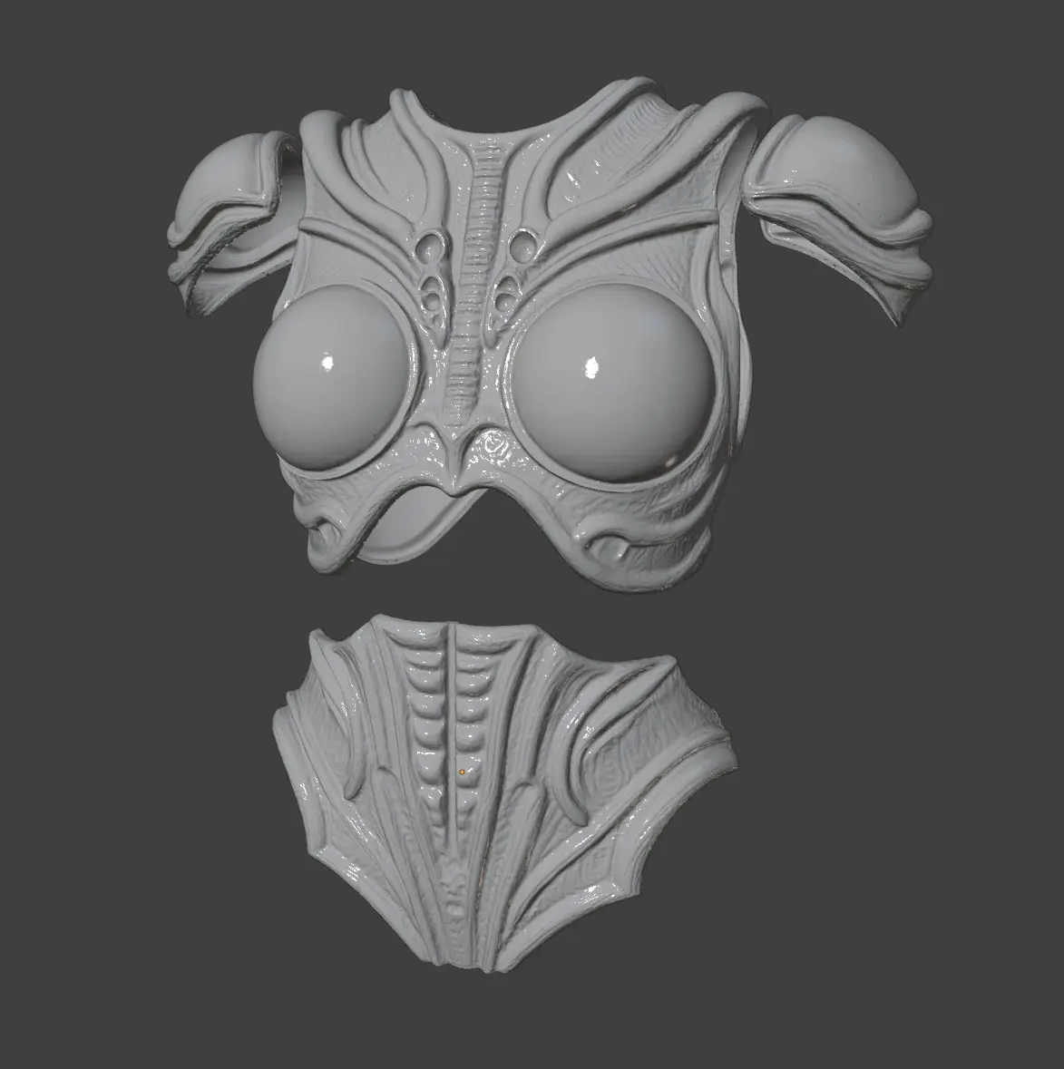 This sci-fi armor set is designed with a smooth, biomechanical style inspired by xenomorph aesthetics. It includes a chestplate, segmented belly armor, and sleek curved pauldrons that together create an aggressive, alien-futuristic silhouette. Ideal for cosplay, collectibles, or stylized action figures.