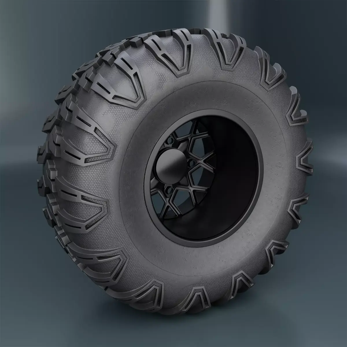 A highly detailed 3D model of an off-road tire with realistic rubber material and deep tread design. The model includes 4K PBR textures, non-overlapping UVs, and vertex colors for enhanced realism. Ideal for automotive visualization, game development, and rendering projects.